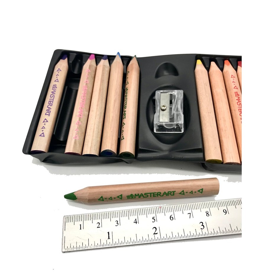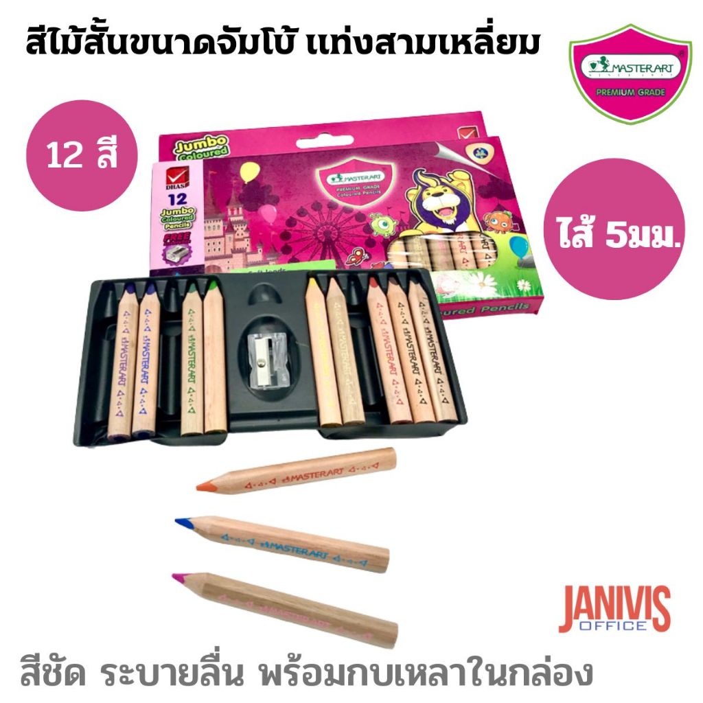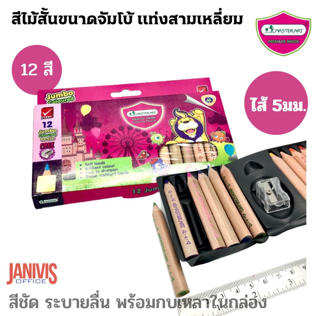 สีไม้ จัมโบ้ แท่งสามเหลี่ยม รุ่นพรีเมี่ยมเกรด สีสด ระบายนุ่ม จับถนัดมือ ไส้ 5มม. 12 สี ตรา Master Art Jumbo
