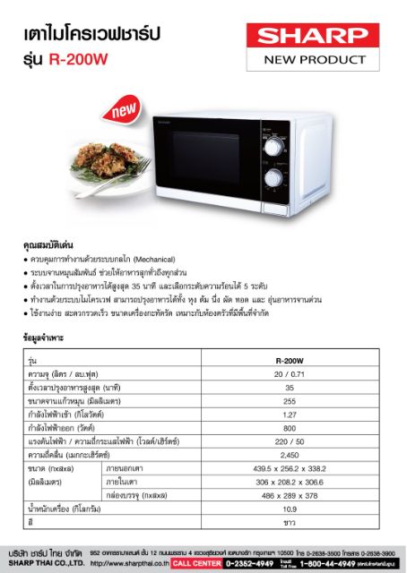 SHARP ไมโครเวฟ ขนาด 20 ลิตร 800w รุ่น R-200W (รับประกันศูนย์ชาร์ป 1 ปี)