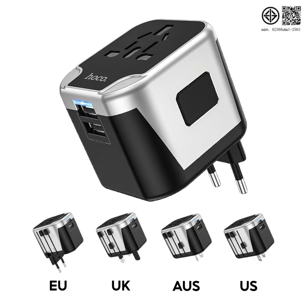 ✅ HOCO AC5 หัวแปลงปลั๊กไฟรอบโลก มีช่อง USB ชิปอัจฉริยะ ตัวเดียวใช้ได้ทุกโซน EU, UK, AUS, US Universal Travel Adapter hc6