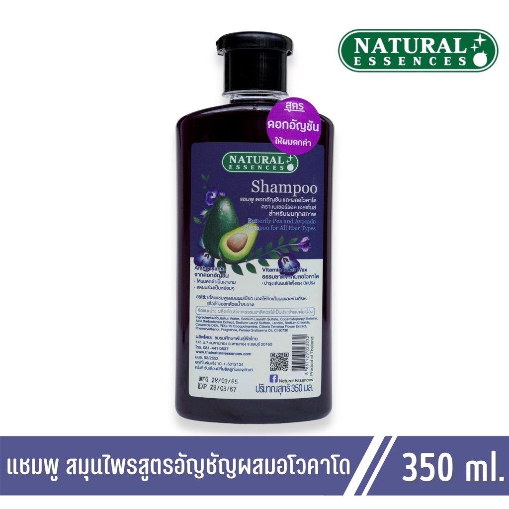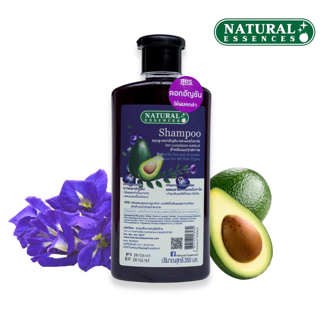 Natural Essences แชมพูสมุนไพร ช่วยลดผมร่วง ผมเสีย แตกปลาย ฟื้นฟูเส้นผมให้แข็งแรง สูตรอัญชัน ผสมอโวคาโด