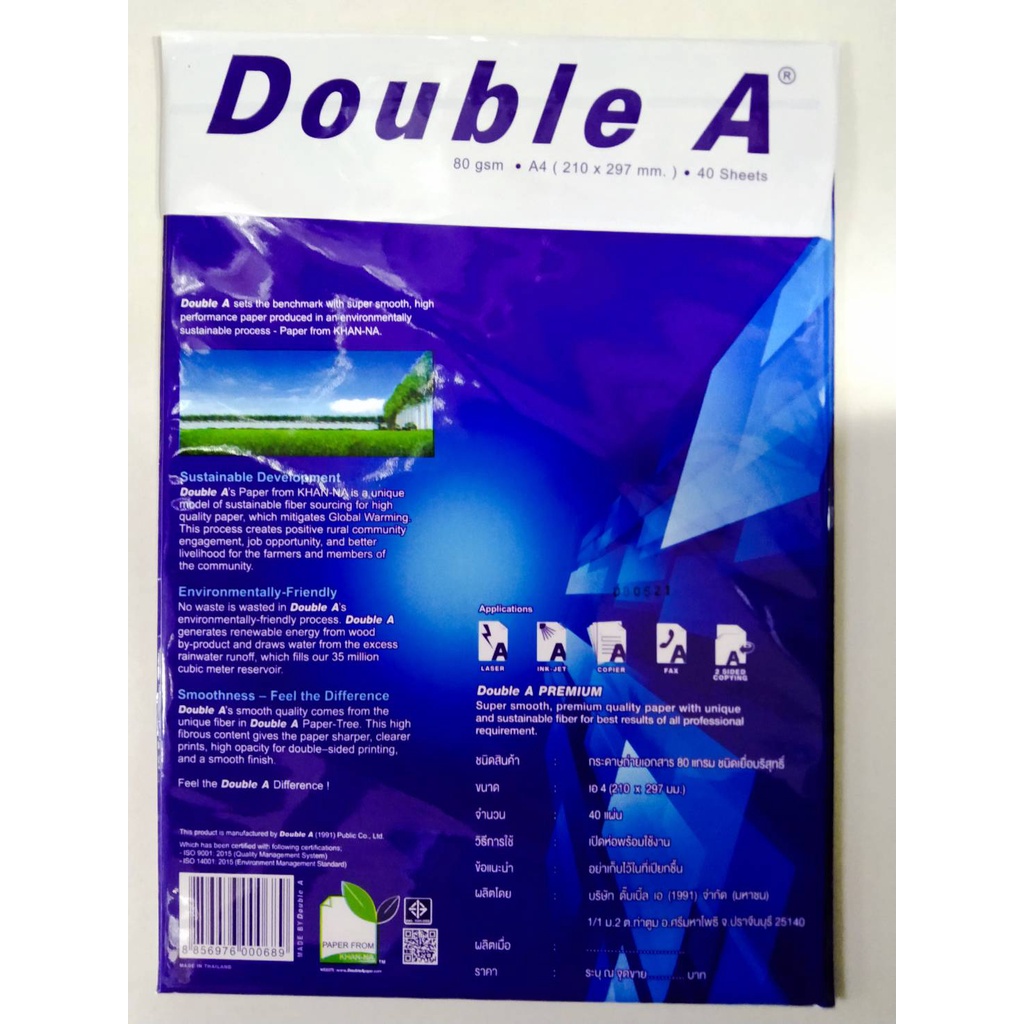 กระดาษถ่ายเอกสาร Double A 80 gsm A4 . 40 Sheets