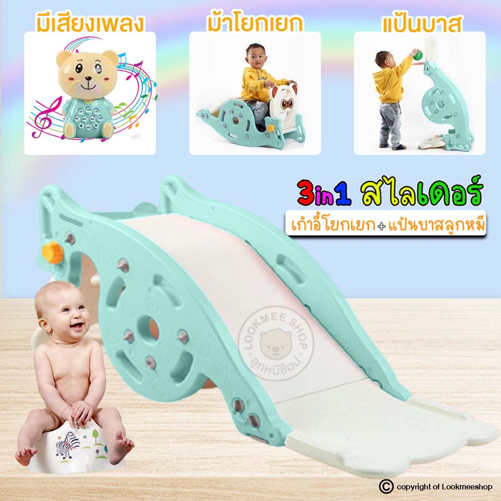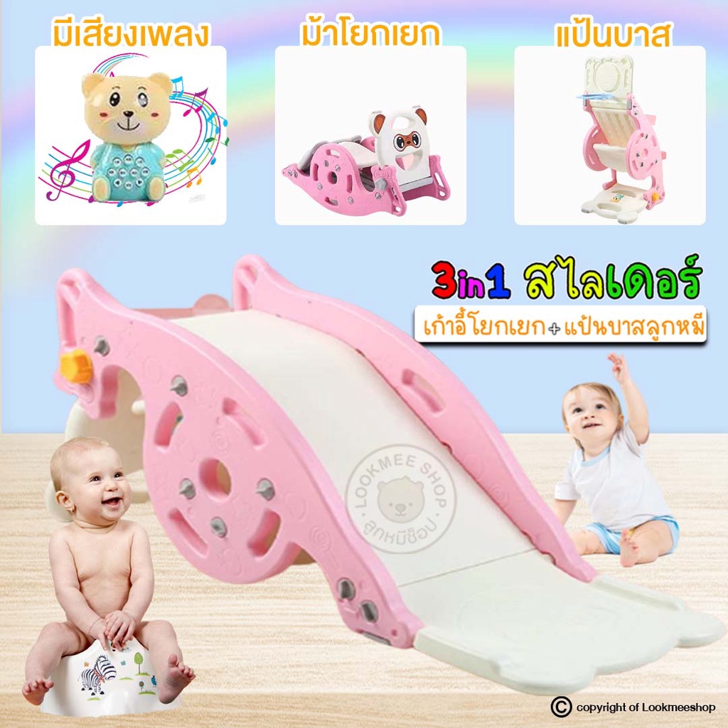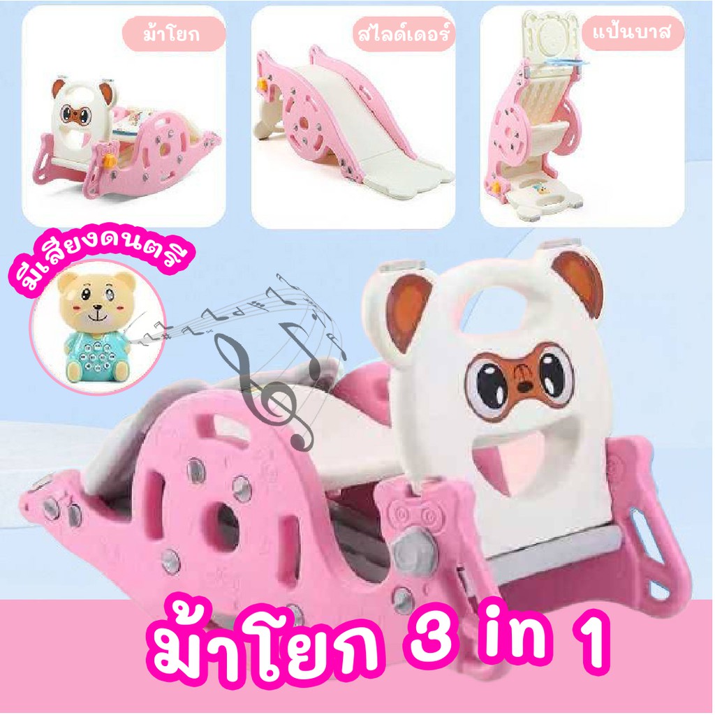 3in1สไลเดอร์มัลติฟังก์ชั่นหมี ม้าโยก กระดานลื่นพับเก็บได้ พร้อมแป้นบาสห่วงขนาดใหญ่ แข็งแรง ของเล่น ราคาถูก มีเสียงดนตรี