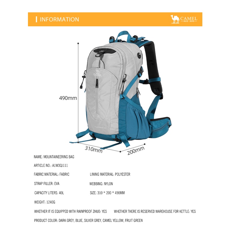 CAMEL CROWN 40Lกระเป๋าเป้สะพายหลังกลางแจ้งเดินทางน้ําหนักเบากระเป๋าเป้สะพายหลังกันน้ําความจุขนาดใหญ่
