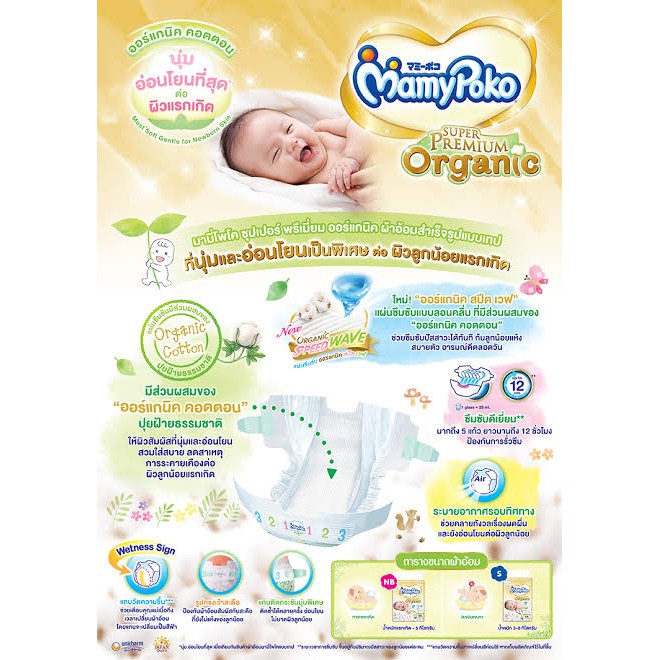 [ยกลัง12แพค]mamypoko มามี่โพโค ผ้าอ้อมเด็ก เทปซุปเปอร์พรีเมี่ยมออร์แกนิค NB120ชิ้น/S96ชิ้น