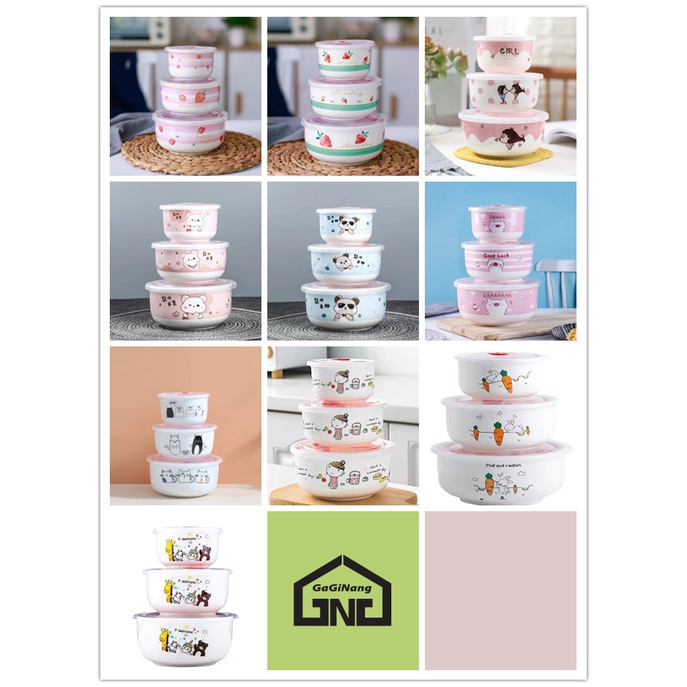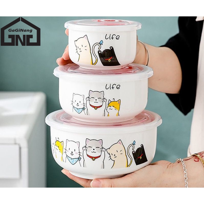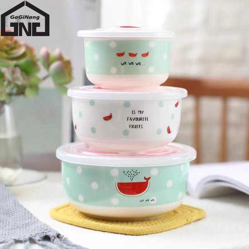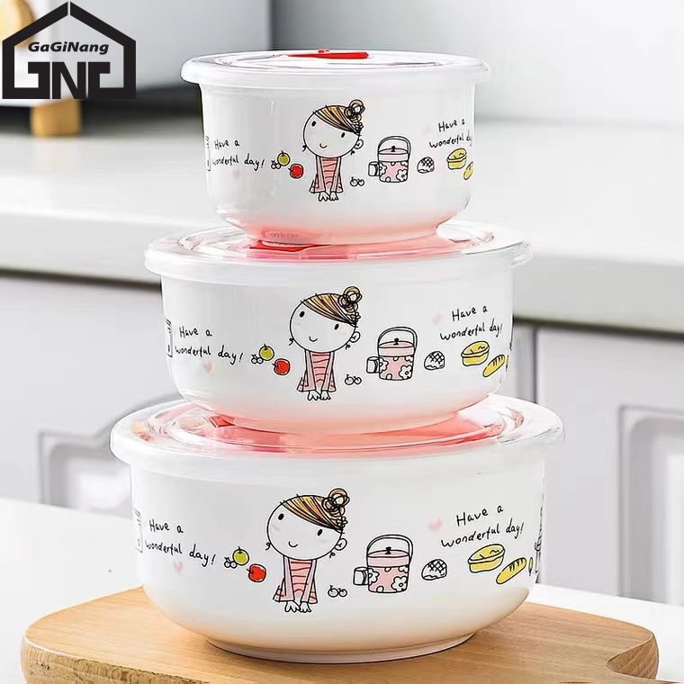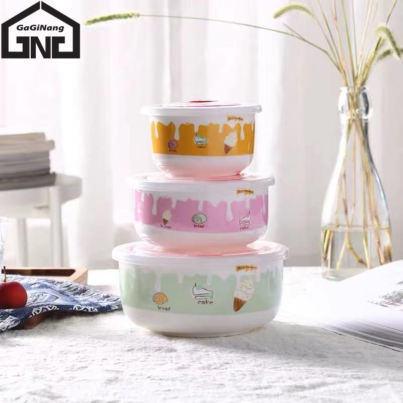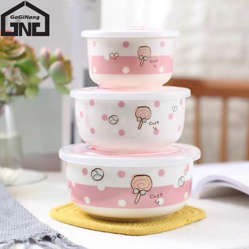 GaGiNang ชุดชามเซรามิค เซรามิค ชามเซรามิค พร้อมฝาปิด 3ใบ/ชุด เข้าไมโครเวฟได้ ชาม ถ้วย