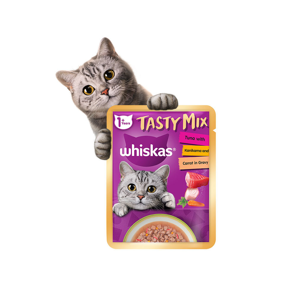 WHISKAS วิสกัส Tasty Mix อาหารแมวเปียก ลูกแมว แมวโต 70 ก. (28 ซอง)