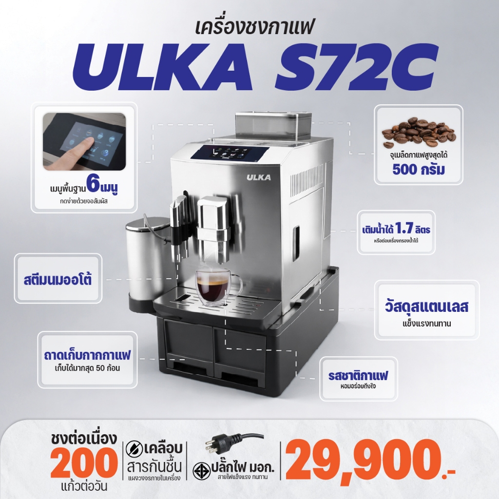 เครื่องชงกาแฟอัตโนมัติ ULKA S72 Commercial เครื่องชงกาแฟ มี มอก. บดกาแฟในตัว จอสัมผัส 3 หัวชง ชงชาไทย ชาเขียว ใช้งานง่าย