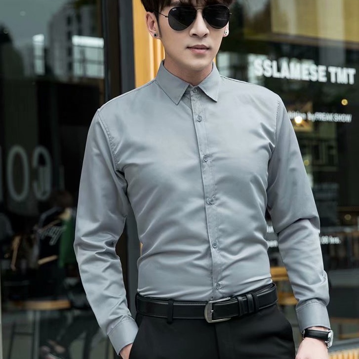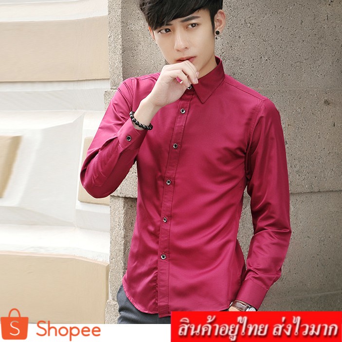 LEO.MAN เสื้อเชิ๊ต แขนยาว ผู้ชาย แต่งกระดุมหน้า สีพื้น รุ่น M021