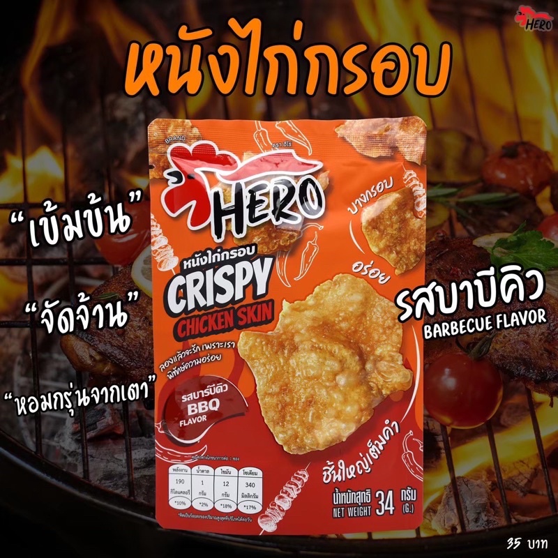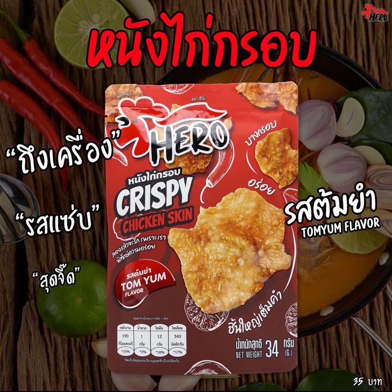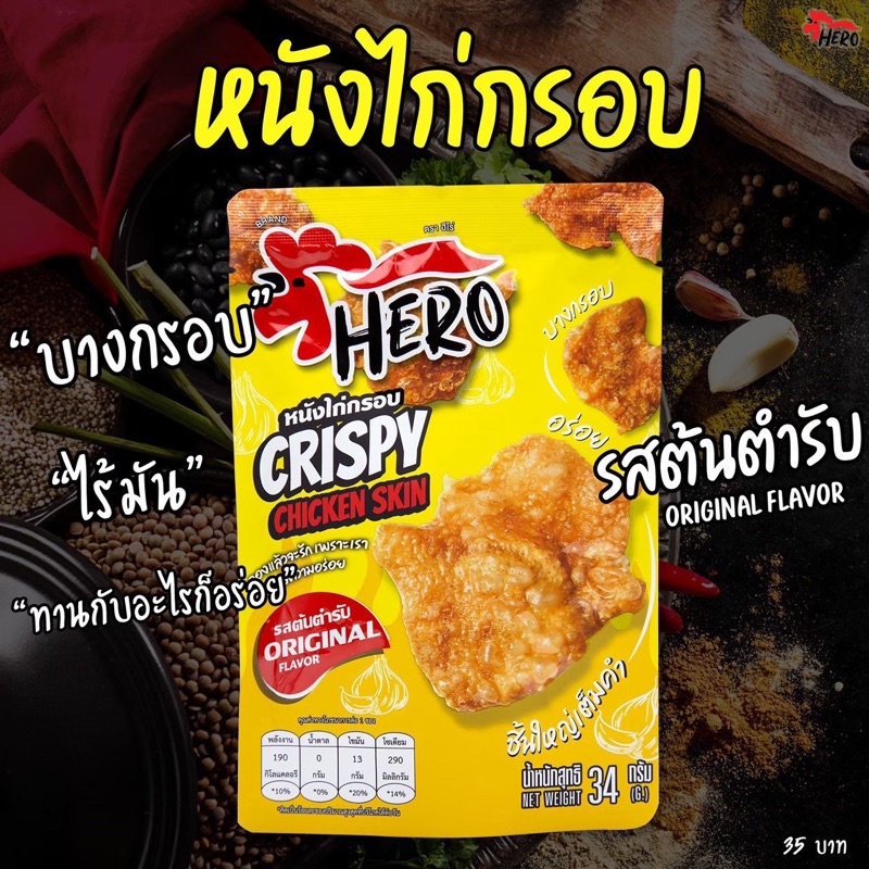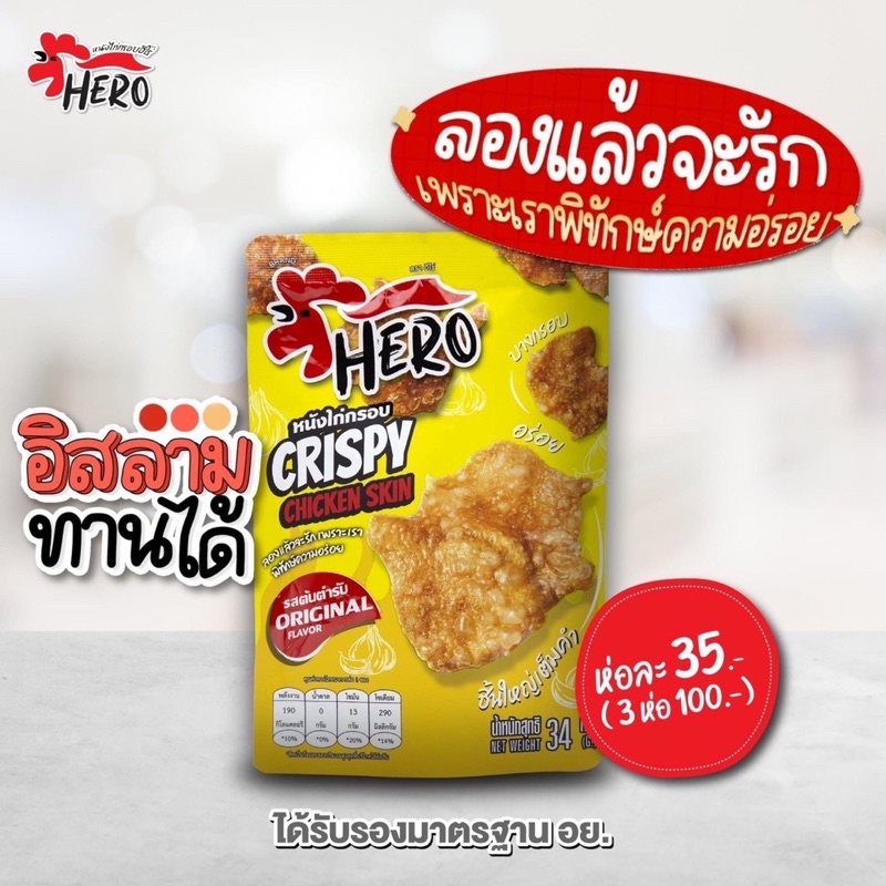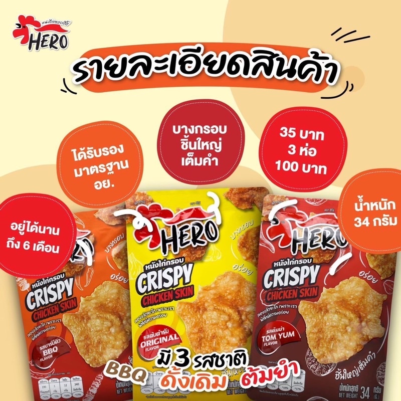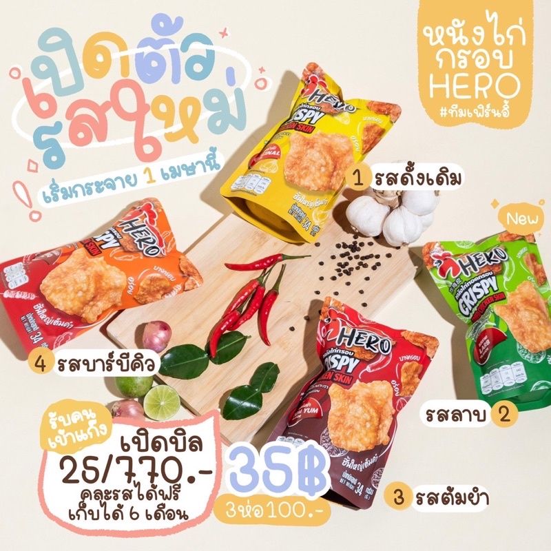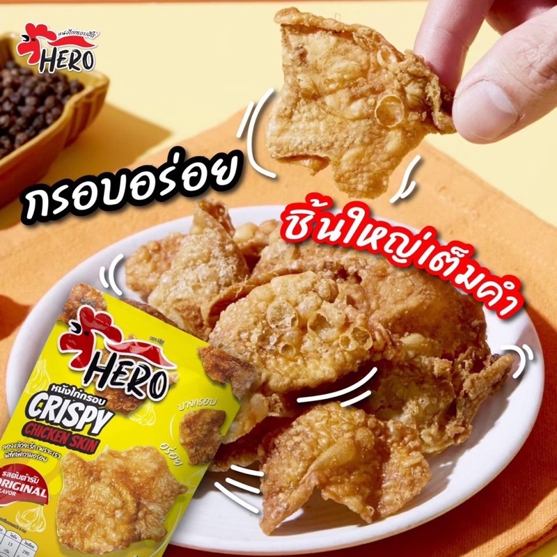 [พร้อมส่ง] หนังไก่กรอบฮีโร่ มี 4 รสชาติ หนังไก่อบกรอบ หนังไก่ทอด คลีน ไร้น้ำมัน กรอบ อร่อย 3ห่อ100 คละรสได้