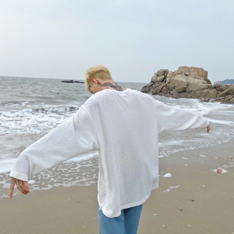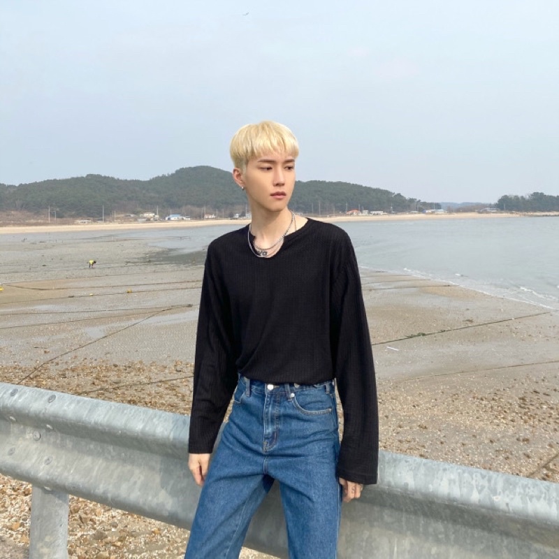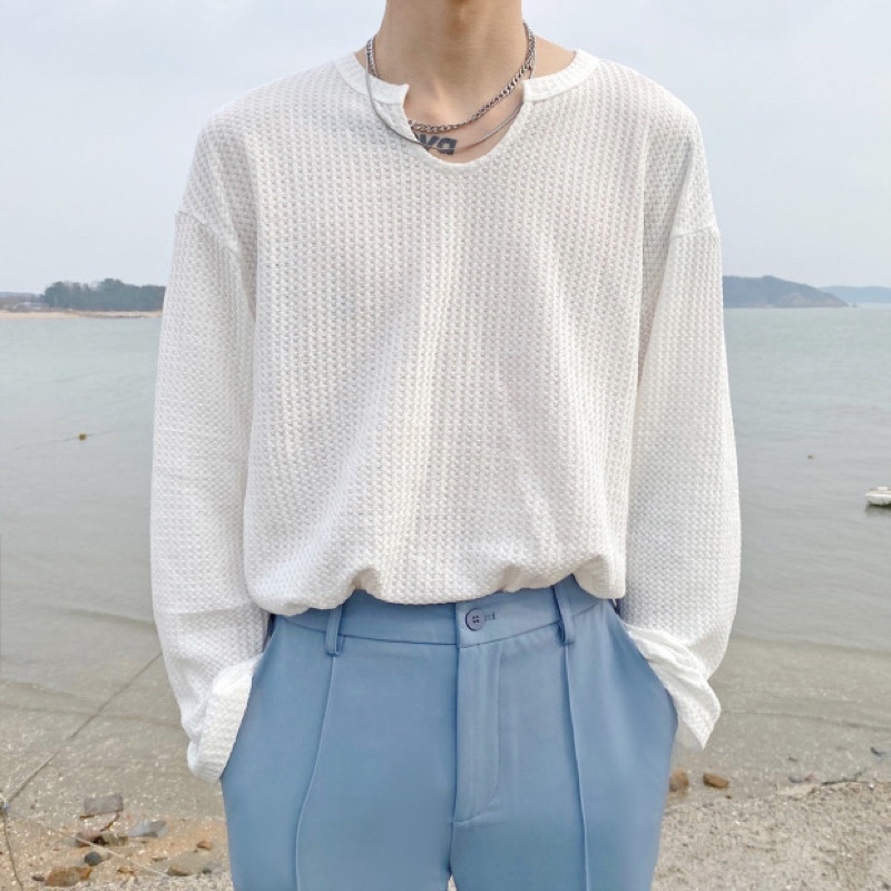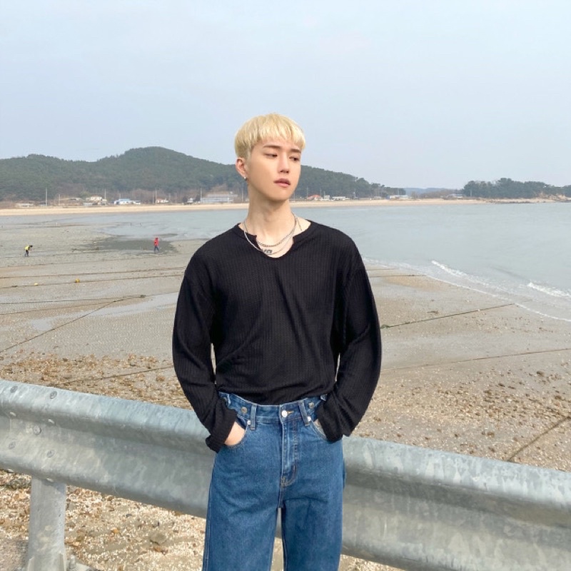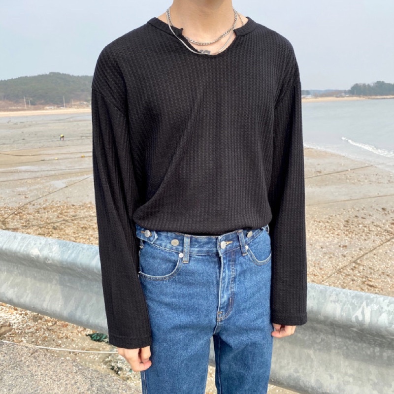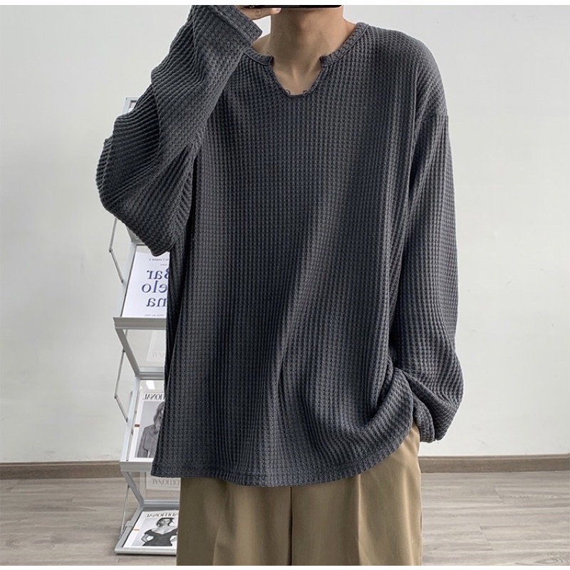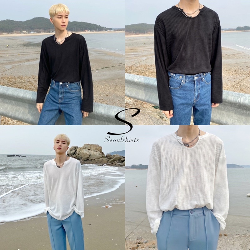 พร้อมส่ง! เสื้อยืดคอเว้า แขนยาวสีพื้น ทรงโอเวอไซส์ สไตล์เกาหลี ผ้านุ่มใส่สบาย ทรงสวย L10
