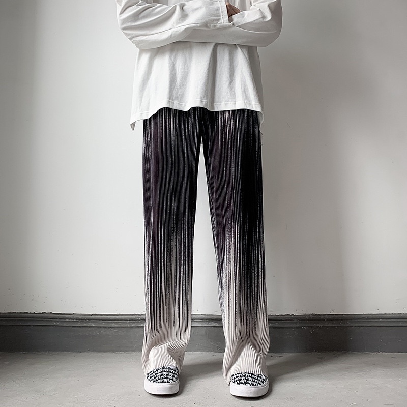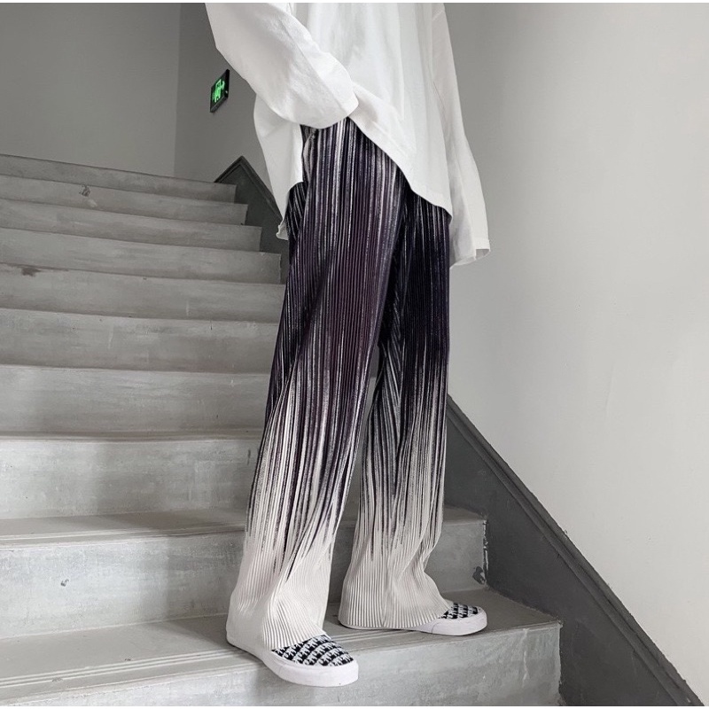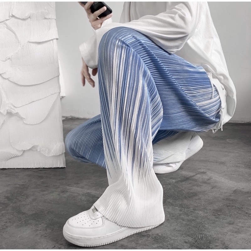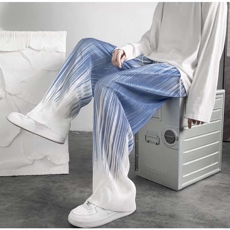 พร้อมส่ง กางเกงอัดพลีท ลายคลื่นสีดำ/ฟ้า ทรงกระบอกใหญ่ ผ้ายืดได้ ใส่สบายไม่ร้อน ทรงสวย สไตล์เกาหลี ผ้าพริ้วทิ้งตัว P039