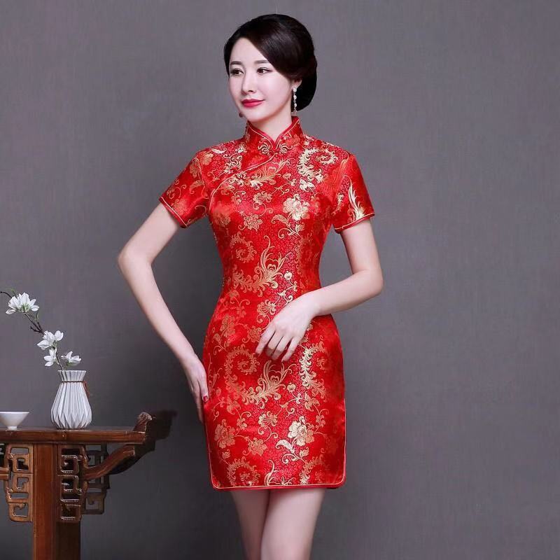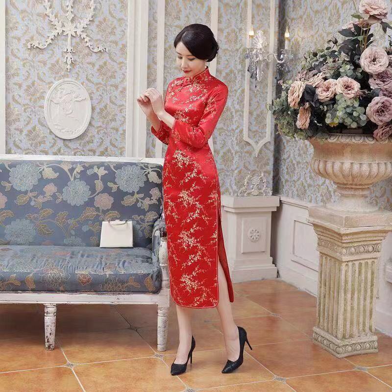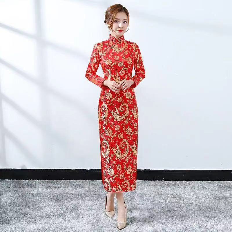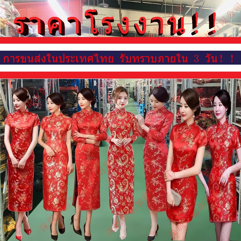 การจัดส่งในประเทศไทย!!!ชุดกี่เพ้าปัก ปักลายมังกร นกฟินิกซ์ สีแดง สไตล์จีนเรโทร สําหรับผู้หญิง
