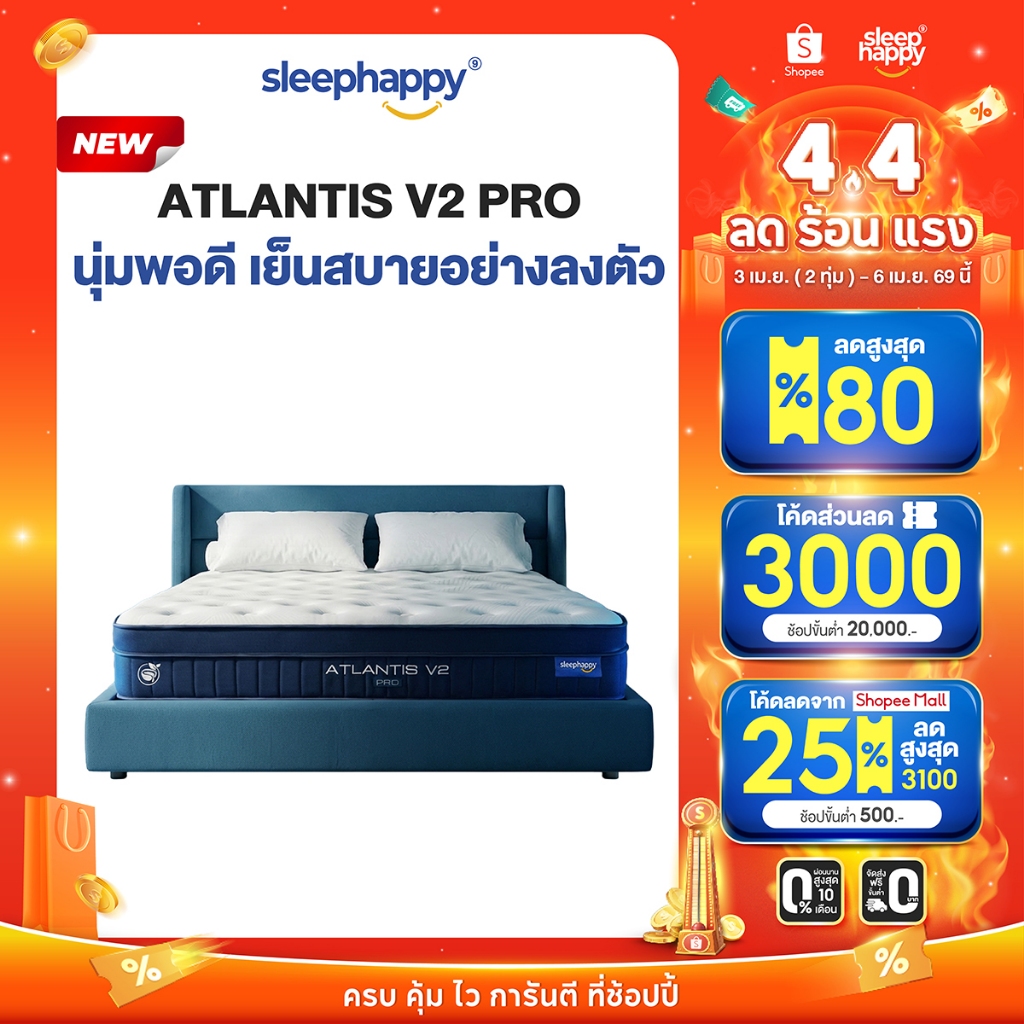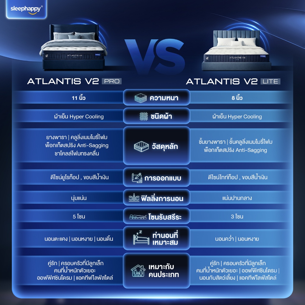 SleepHappy ที่นอนยางพาราและพ็อกเก็ตสปริง สัมผัสเย็น รุ่น Atlantis V2 Pro หนา 11 นิ้ว และ Atlantis V2 Lite หนา 8 นิ้ว