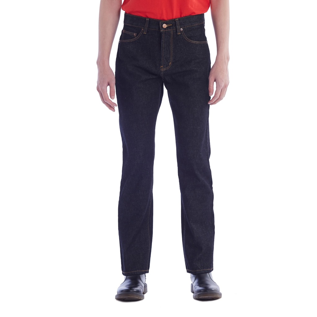 Hara กางเกงยีนส์ กางเกงยีนส์ผู้ชาย สีมิดไนท์ ทรงกระบอกตรง ทรงกระบอกขาตรง ด้ายทอง ป้ายหนัง รุ่น HMR1-900502