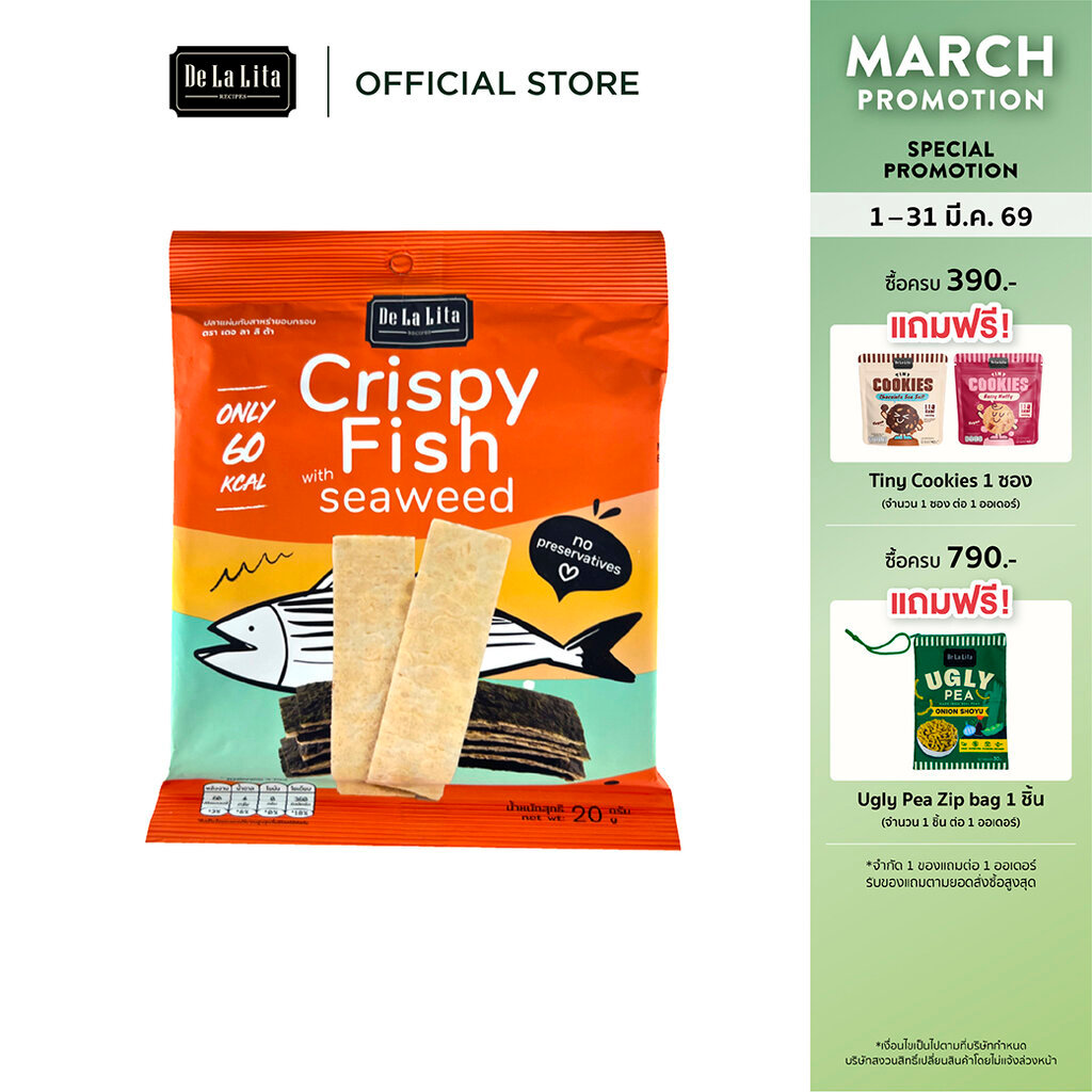 [1 ซอง] CRISPY FISH WITH SEAWEED 20 กรัม อร่อย แคลต่ำ ไม่ทอด De La Lita เดอลาลิต้า สาหร่ายและปลาแผ่นอบกรอบ ขนมคลีน