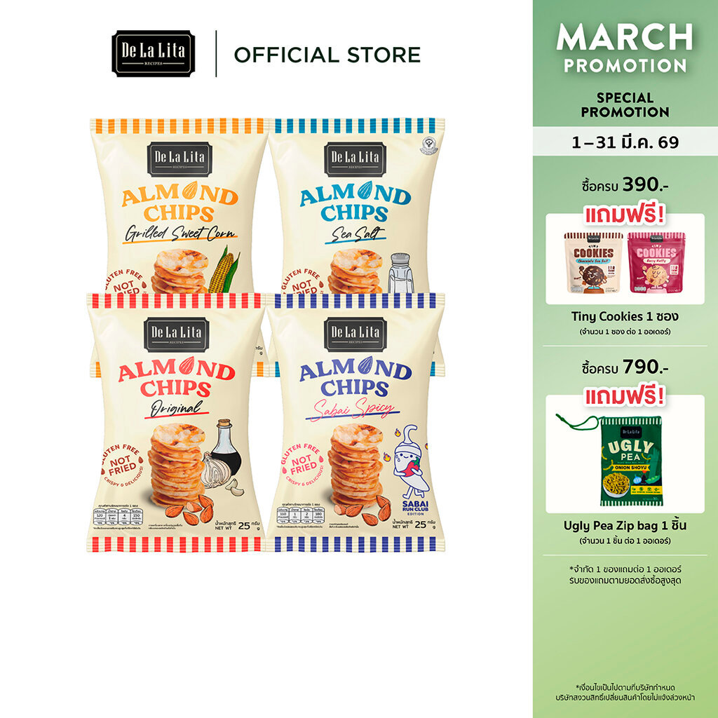 [1 ซอง] ALMOND CHIPS 25 กรัม ขนมอบกรอบอร่อย แคลต่ำ ไม่ทอด เจ วีแกน De La Lita เดอลาลิต้า อัลมอนด์ชิปส์ ขนมคลีน