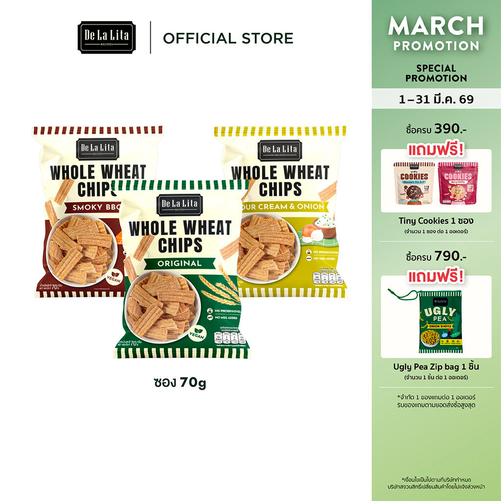 [ยกลังซองใหญ่] WHOLE WHEAT CHIPS 70 กรัม ขนมอบกรอบอร่อย แคลต่ำ ทำจากโฮลวีต De La Lita เดอลาลิต้า โฮลวีตชิปส์ ขนมคลีน