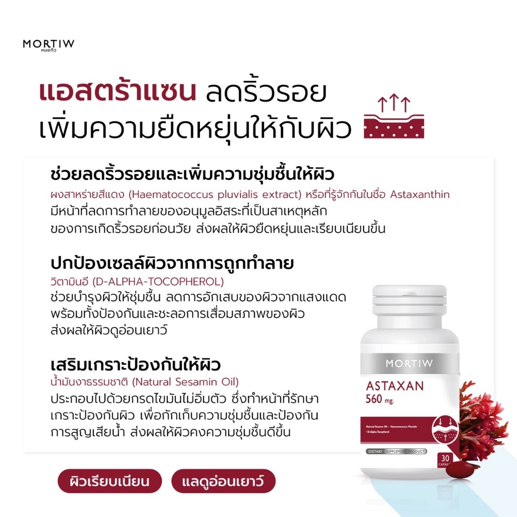 MORTIW หมอทิว ASTAXAN เพิ่มความชุ่มชื้นผิว ต้านอนุมูลอิสระ จุดด่างดำ Soft Gel 30 แคปซูล 560 mg.