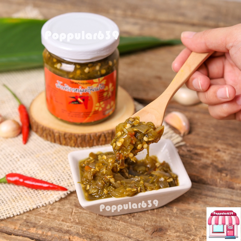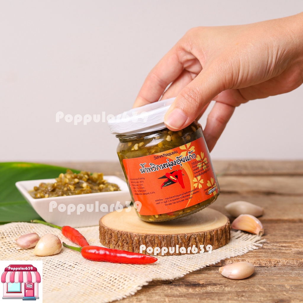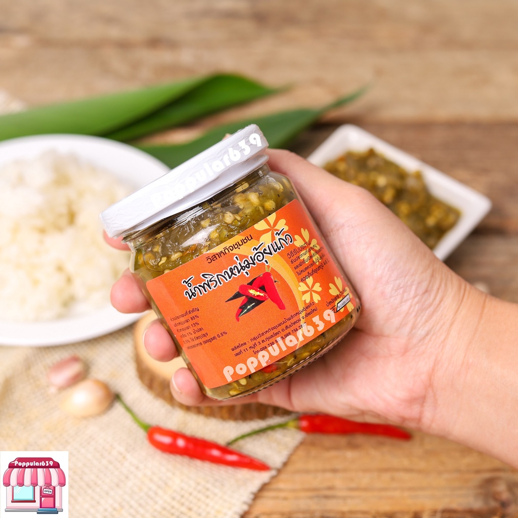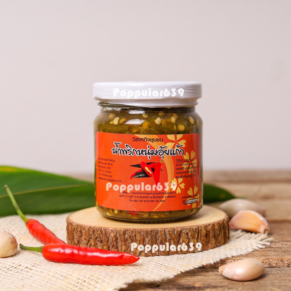 น้ำพริกหนุ่มอุ้ยแก้ว เชียงใหม่ สูตรเผ็ดน้อย ขนาด 170 กรัม เก็บไว้ได้นาน ใช้วิธีการพาสเจอร์ไรส์ ไม่เปิดฝาไม่เสีย
