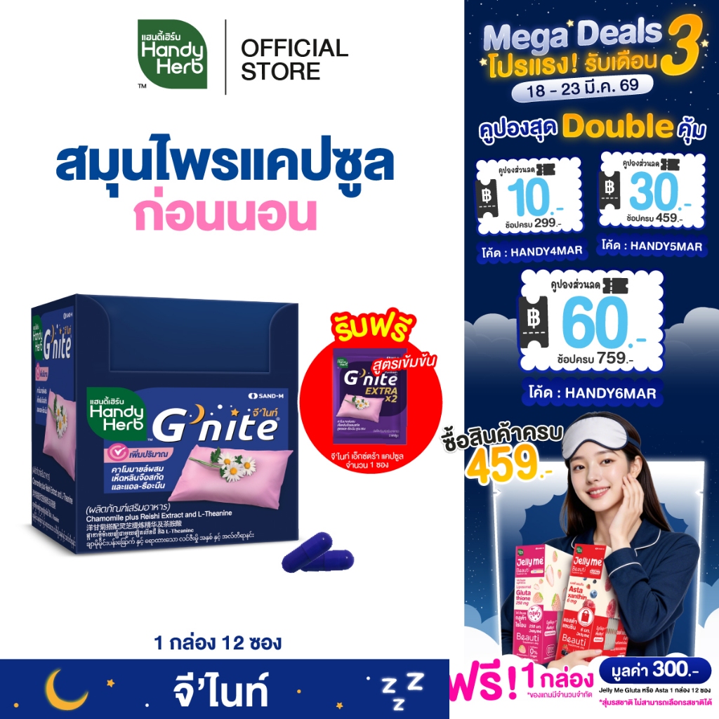 ฟรี! จี'ไนท์ เอ็กซ์ตร้า แคปซูล 1 ซอง HandyHerb G'nite Capsule จี'ไนท์ แคปซูล สมุนไพรก่อนนอน ชนิดกล่อง 1 กล่อง (12 ซอง)