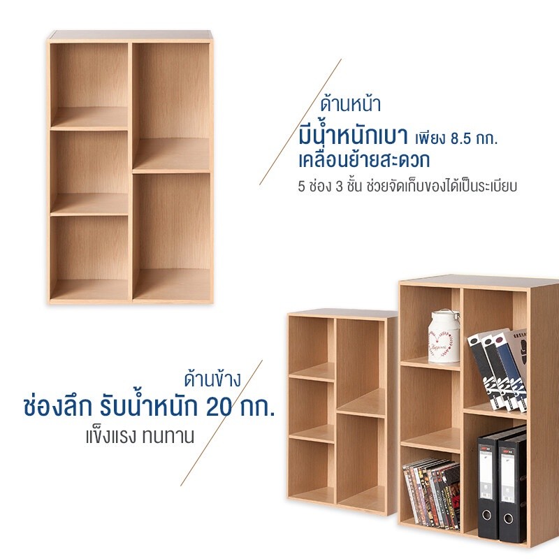 HomeHuk ชั้นวางของไม้ ชั้นวางหนังสือไม้ 3 ชั้น 5 ช่อง