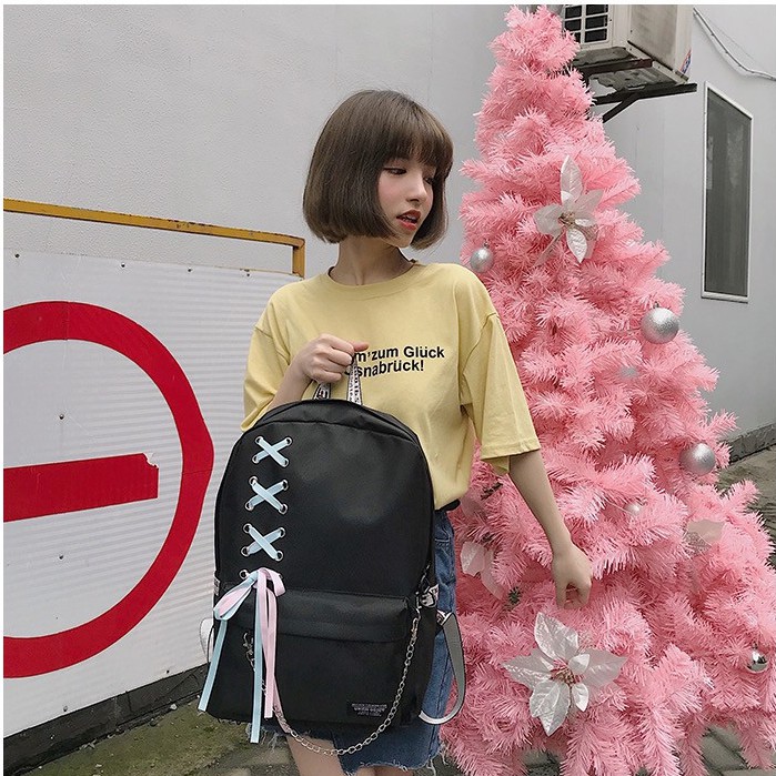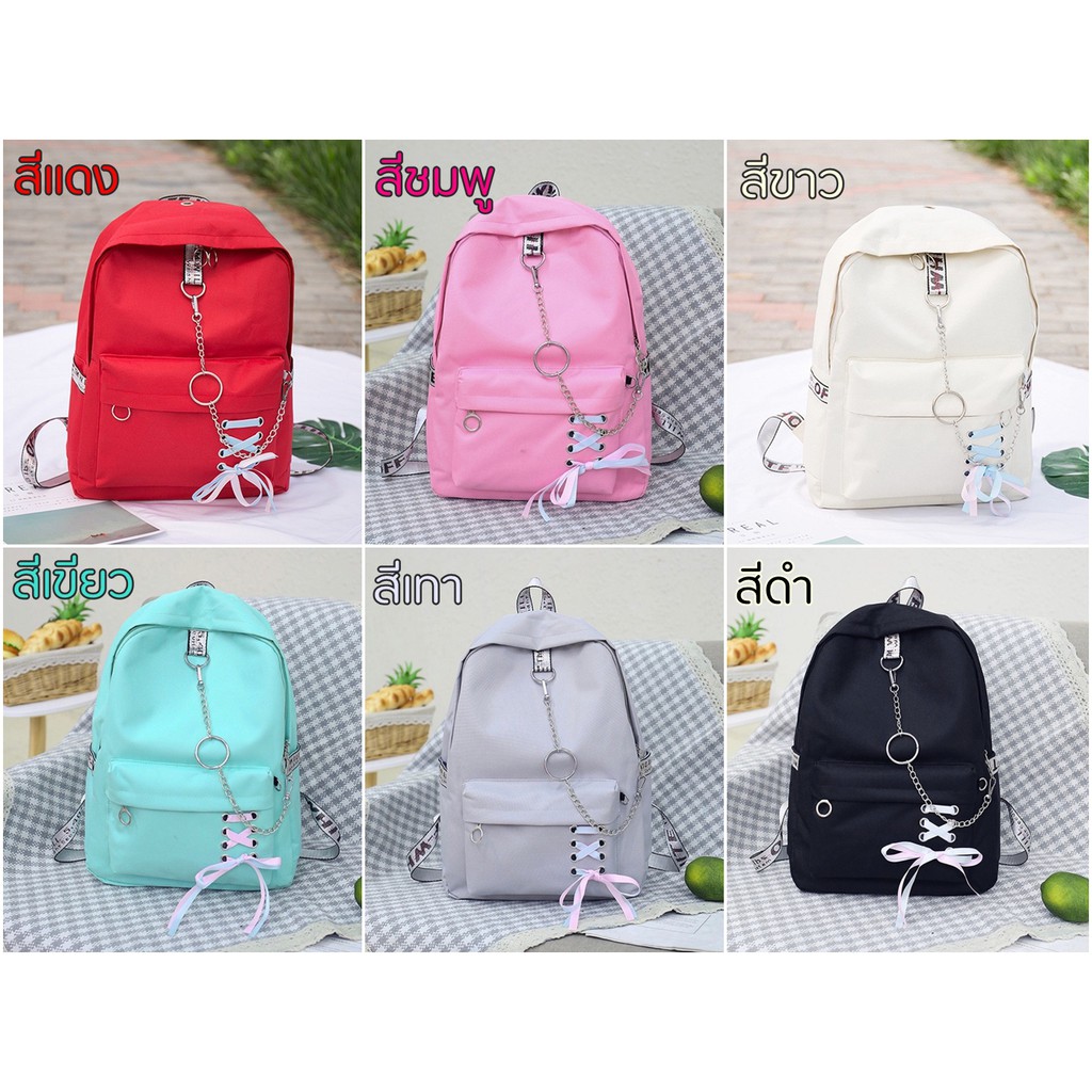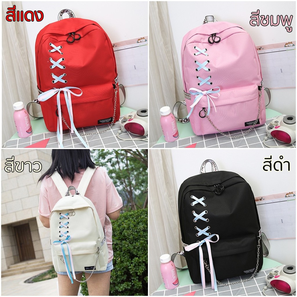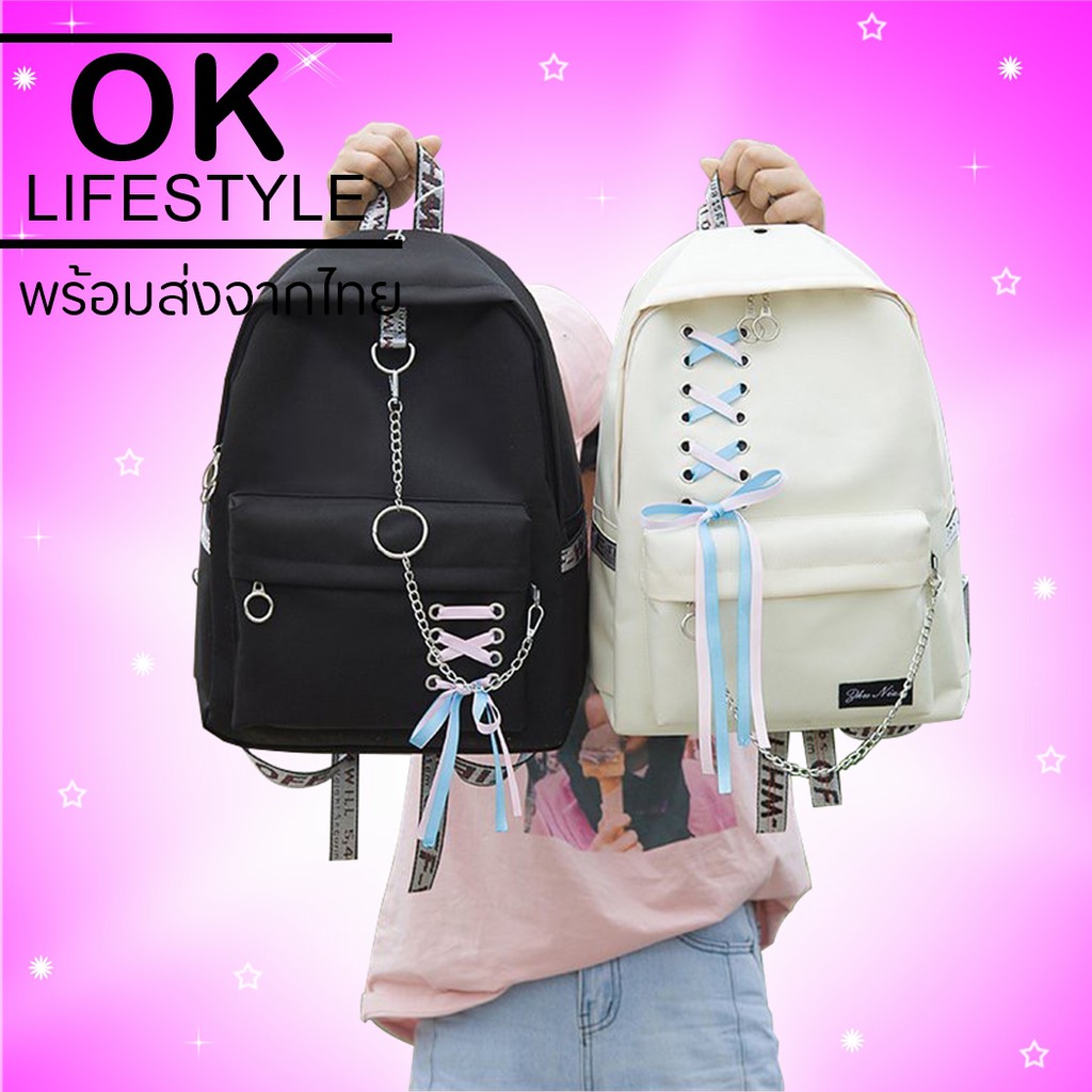 [โค้ดลดเพิ่ม 1517MMS] #OK0034 กระเป๋าเป้สะพายหลังแต่งโบว์ มีโซ่คล้อง เก๋ๆ