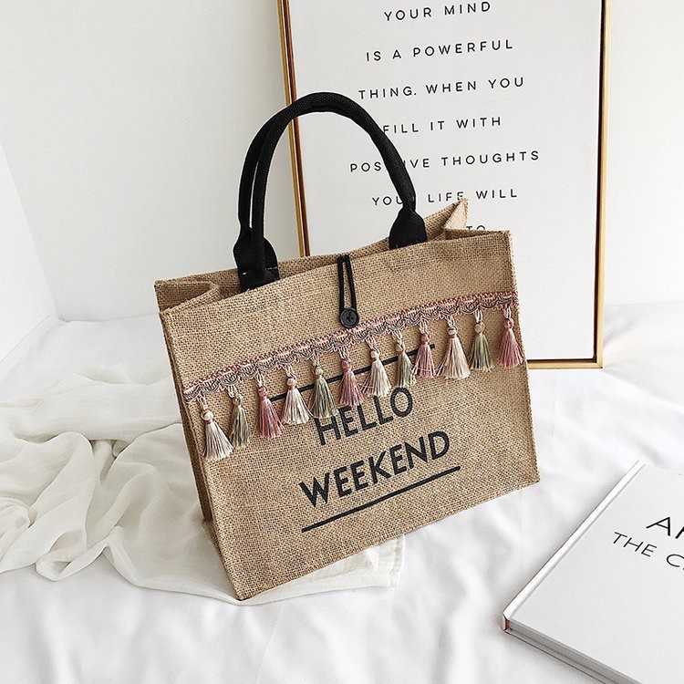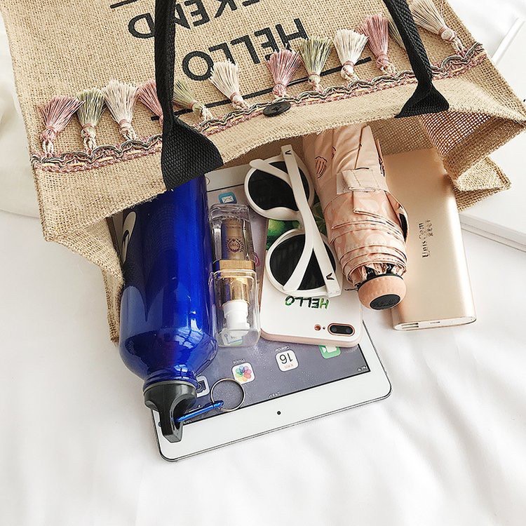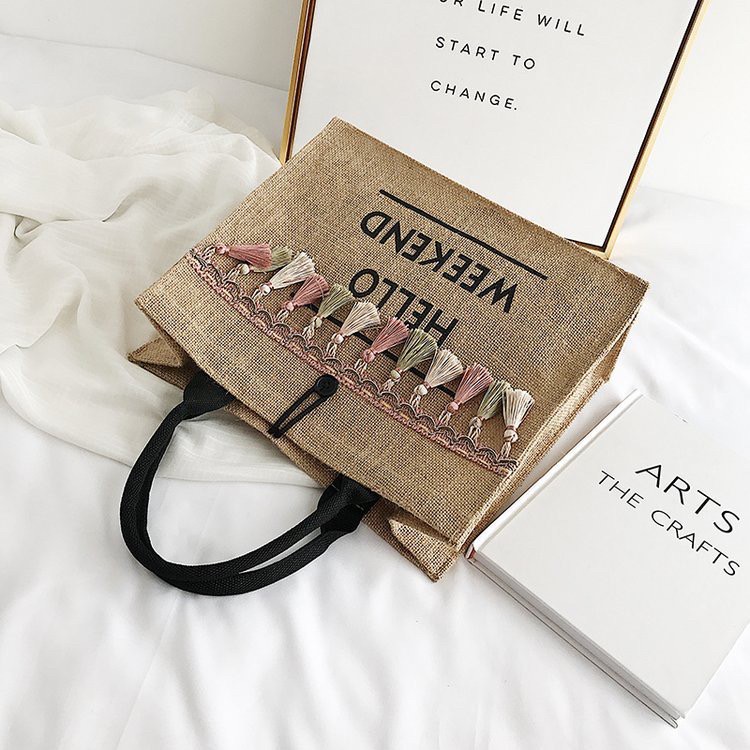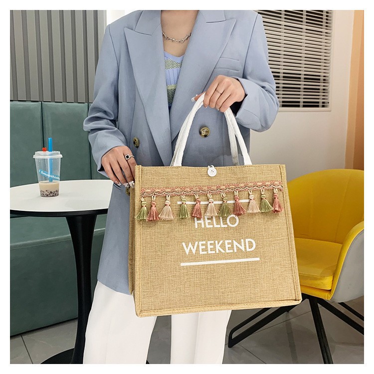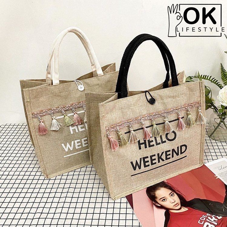 [BANYN155 ลด 25.-] #OK0042 กระเป๋าผ้ากระสอบ พู่ห้อย HELLO WEEKEND