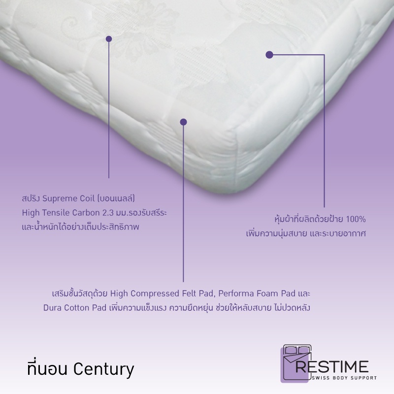 Restime ที่นอนระบบสปริง Supreme Coil หนา 10 นิ้ว รุ่น Century-แถมหมอนหนุนฟรี