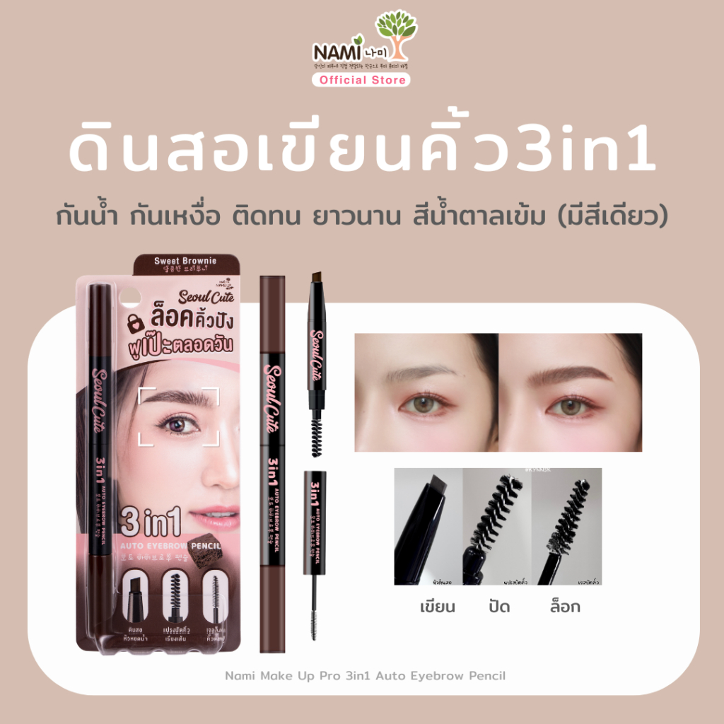 ดินสอเขียนคิ้ว 3in1 ดินสอ/แปรง/เจลล็อค เขียนง่าย Nami Make Up Pro Seoul Cute 3in1 Auto Eyebrow Pencil