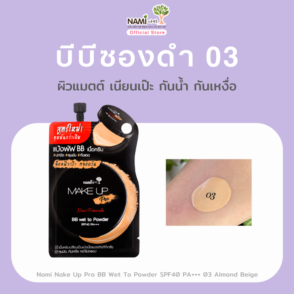 บีบีซองดำ No.03 (ผิวสองสี) แมตต์ ปกปิด คุมมัน กันน้ำ Nami Make Up Pro BB Wet to Powder SPF40 PA+++