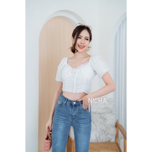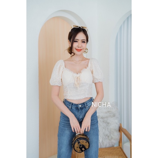 NICHA online🛒🌈เสื้อครอป แขนตุ๊กตา ผ้าลูกไม้ เสริมฟองน้ำ แต่งโบว์อก มีซิปด้านหลัง สามารถปรับได้ น่ารักๆๆ 🌸🥰