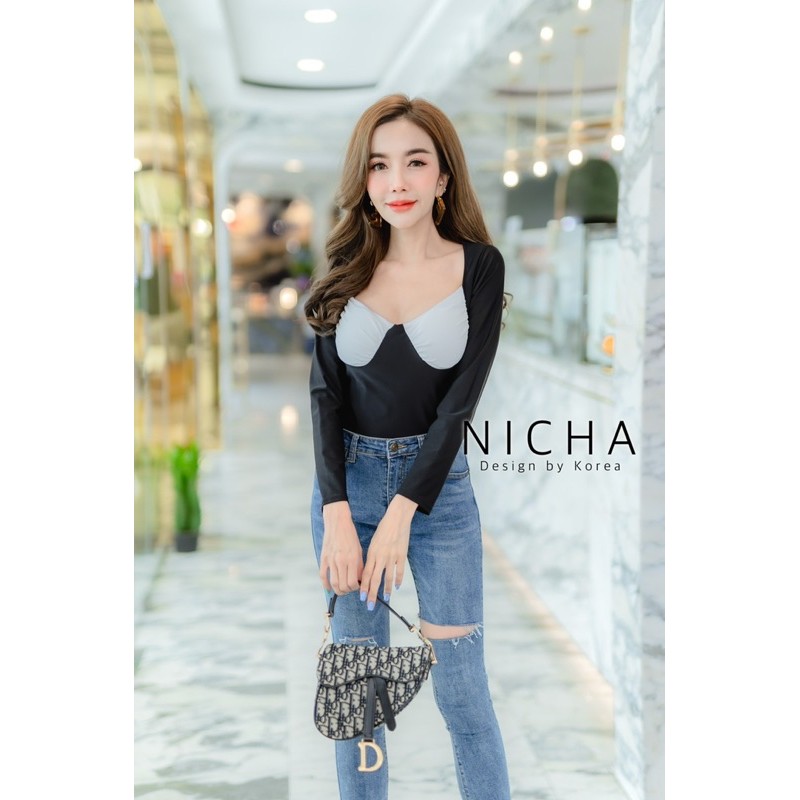 บอดี้สูทผ้ายืดเกาหลี บอดี้สูทแขนยาว แต่งสีตัดกับสีเสื้อ