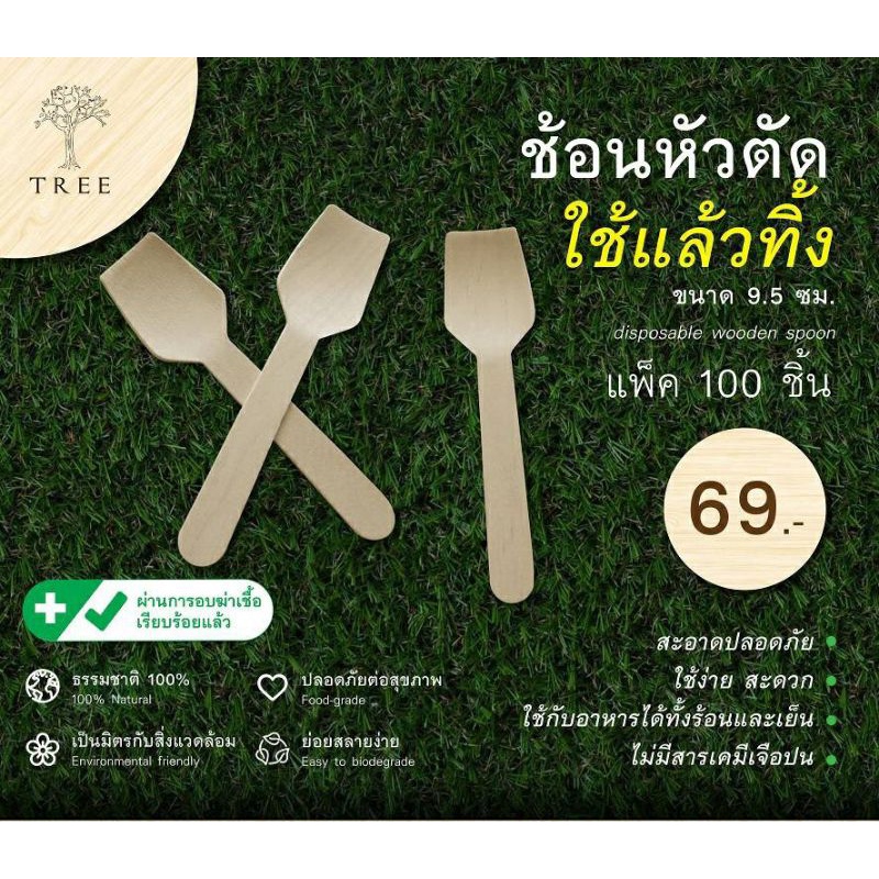 TREE ช้อนไม้หัวตัดแบบใช้แล้วทิ้ง ช้อนไม้รักษ์โลกขนาด9.5ซม.(แพ็ค100ชิ้น)