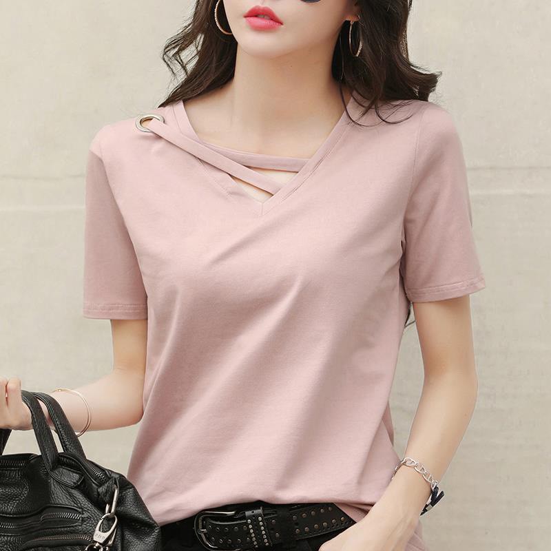 NEWรุ่น-313 เสื้อยืดคอวีแขนสั้นผู้หญิงฤดูร้อนปี 2021 ใหม่ที่รักคอสีทึบครึ่งแขนสั้นผ้านิ่มใส่สบาย ๆ bottoming เสื้อ