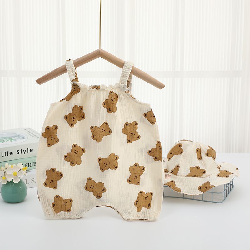 ชุดจั๊มสูทรอมเปอร์ ผ้าฝ้ายแท้ พร้อมหมวก แฟชั่นฤดูร้อน สไตล์เกาหลี สําหรับเด็กผู้ชาย และเด็กผู้หญิง อายุ 0-18 เดือน