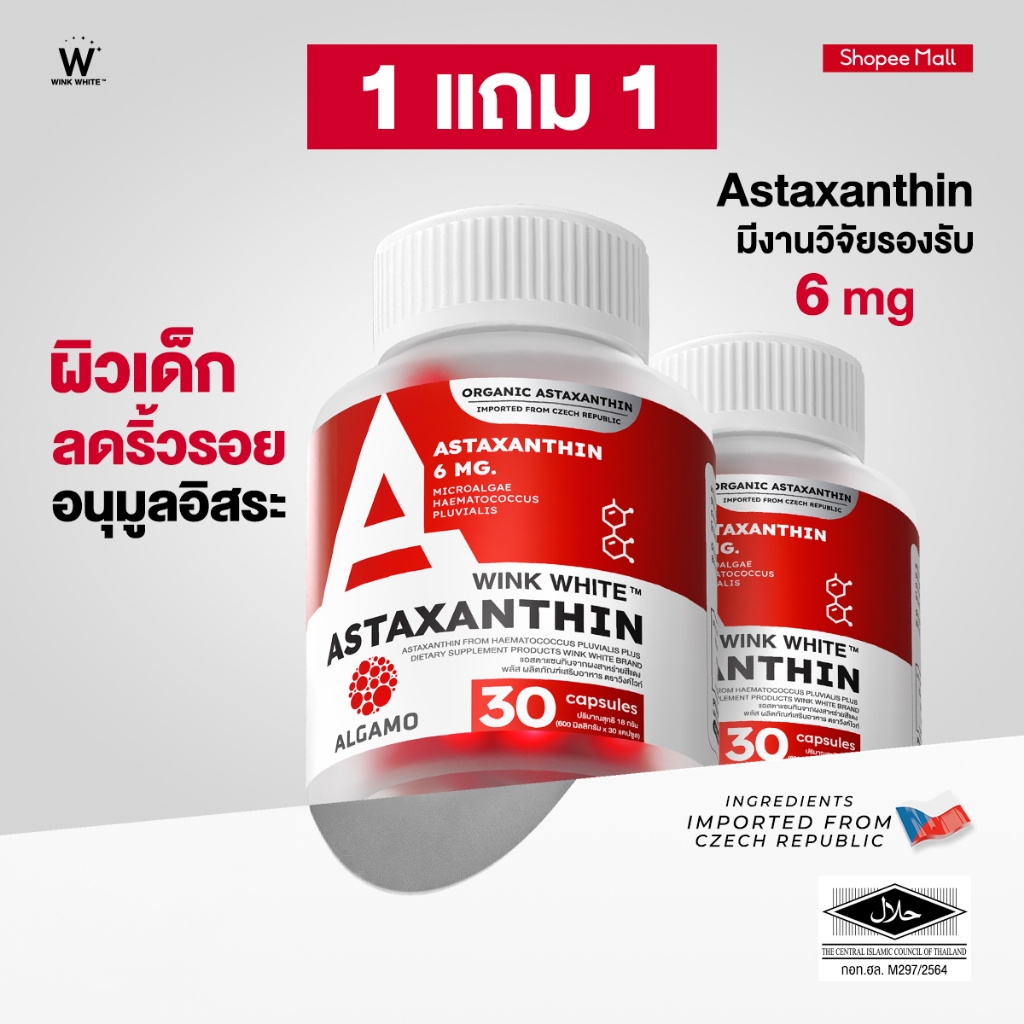WINK WHITE แอสต้าแซนทิน 6 มก. ลดริ้วรอย ต้านแก่ ชะลอวัย นำเข้าจากย ุโรป 🇨🇿 (1 กระปุก 30 แคปซูล)