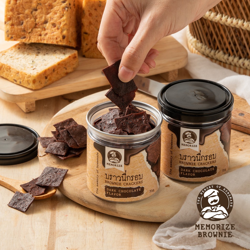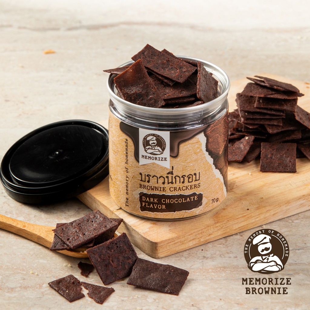 บราวนี่กรอบจาก Memorize Brownie ขนมบราวนี่อบกรอบรสช็อกโกแลต เข้มข้น Brownie Crackers แผ่นบางกรอบ