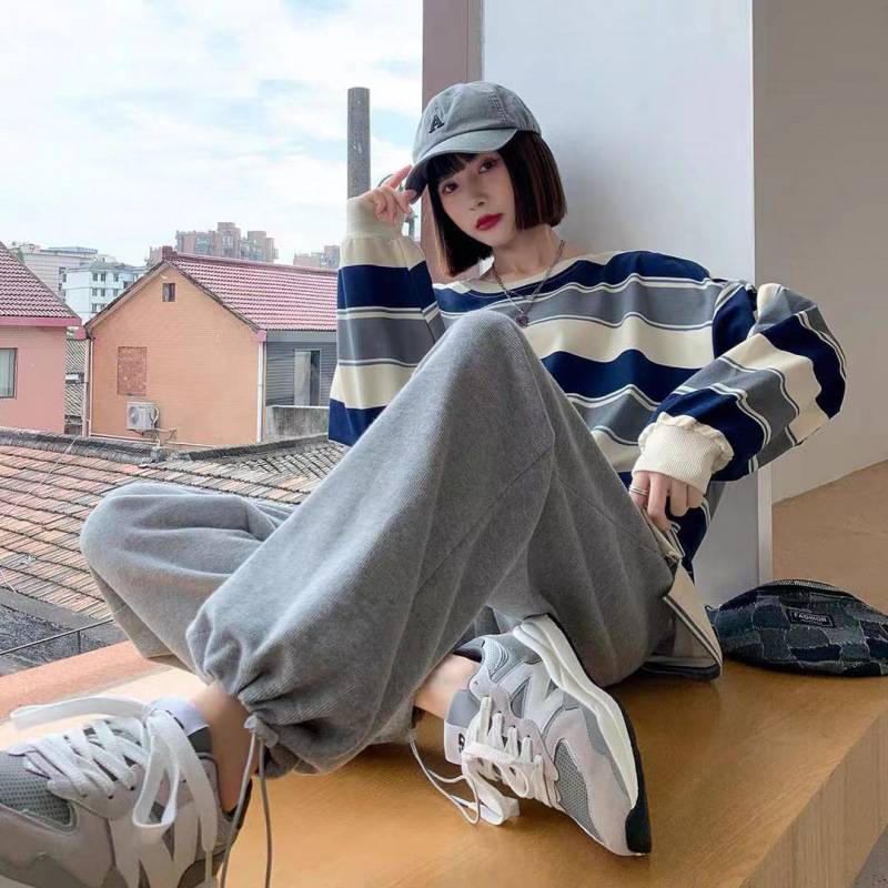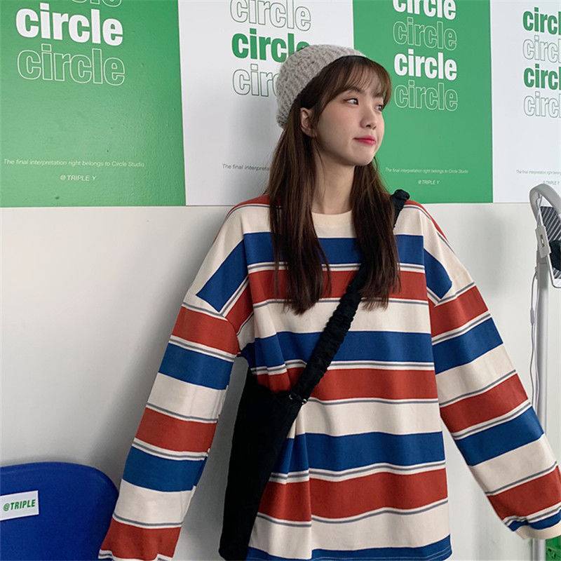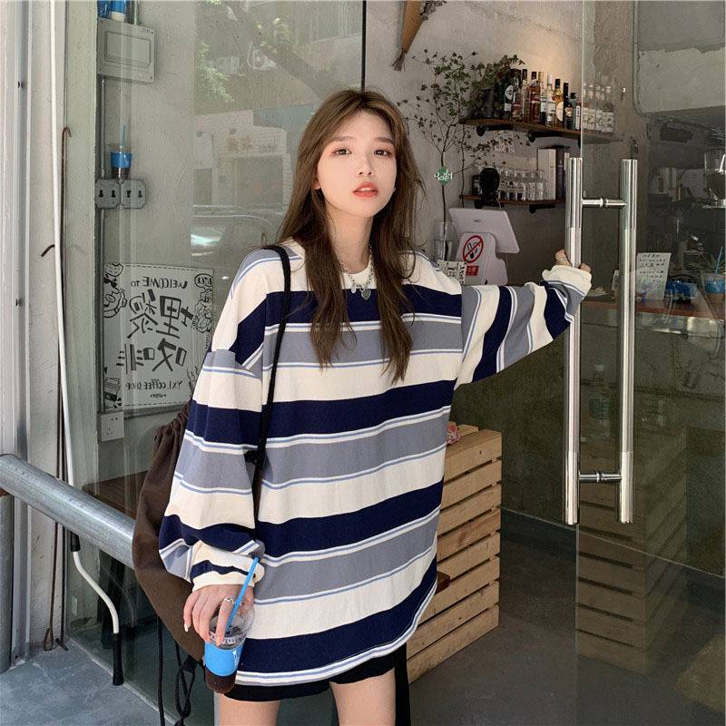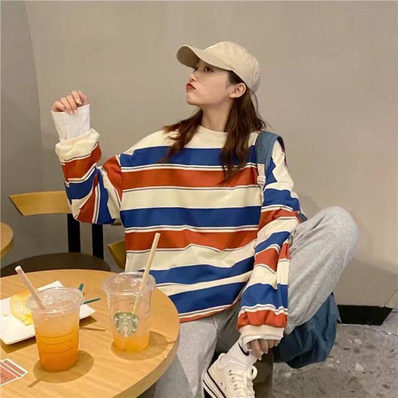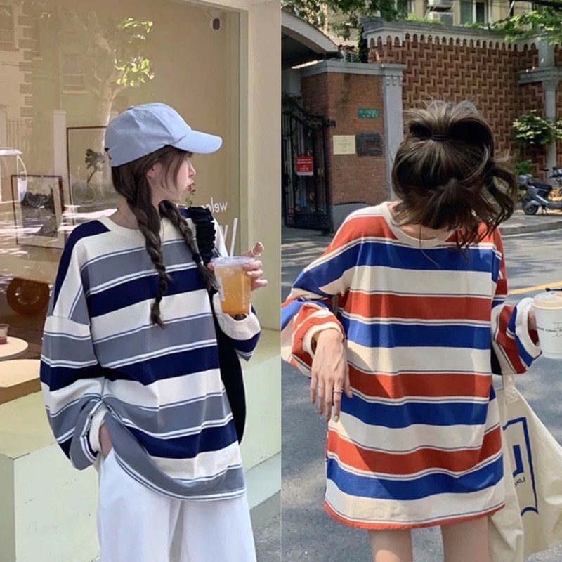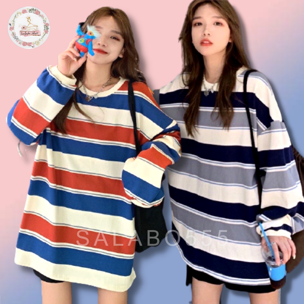 SALABO(พร้อมส่ง)เสื้อแขนยาวผ้า COTTON คอกลม Oversize ลายทาง กันหนาว ผ้าหนา #392