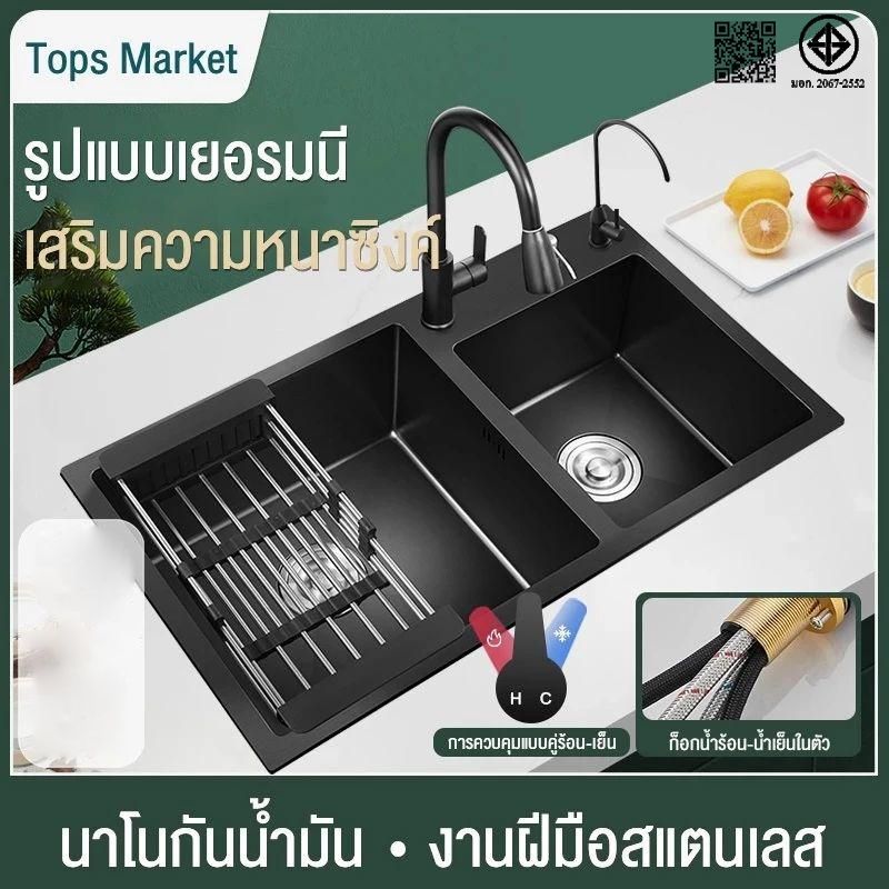 อ่างล้างผักหลุมเดี๋ยวหลุมคู่สแตนเลส304 ซิงก์ล้างจานหลุมเดี๋ยวหลุมคู่ตะกร้าระบายน้ำแบบพับเก็บได้สำหรับติดตั้งบนและล่าง