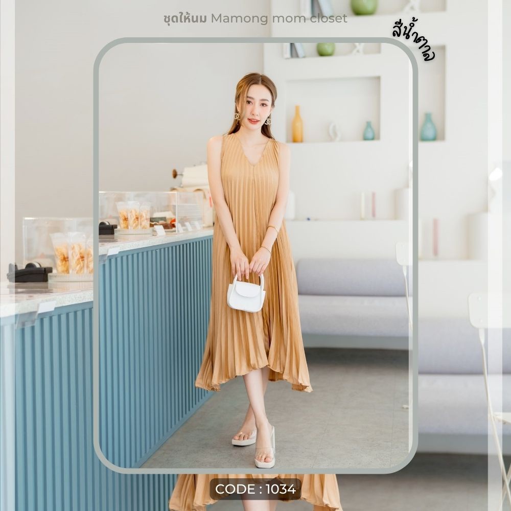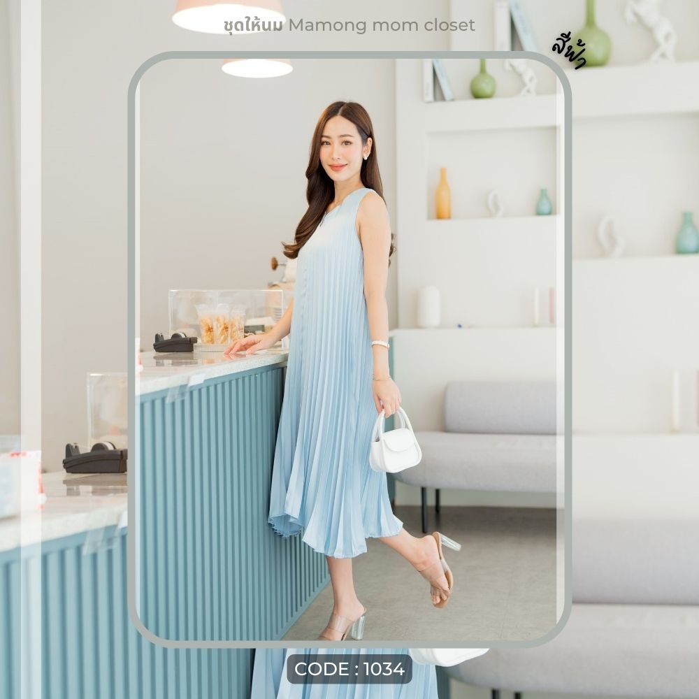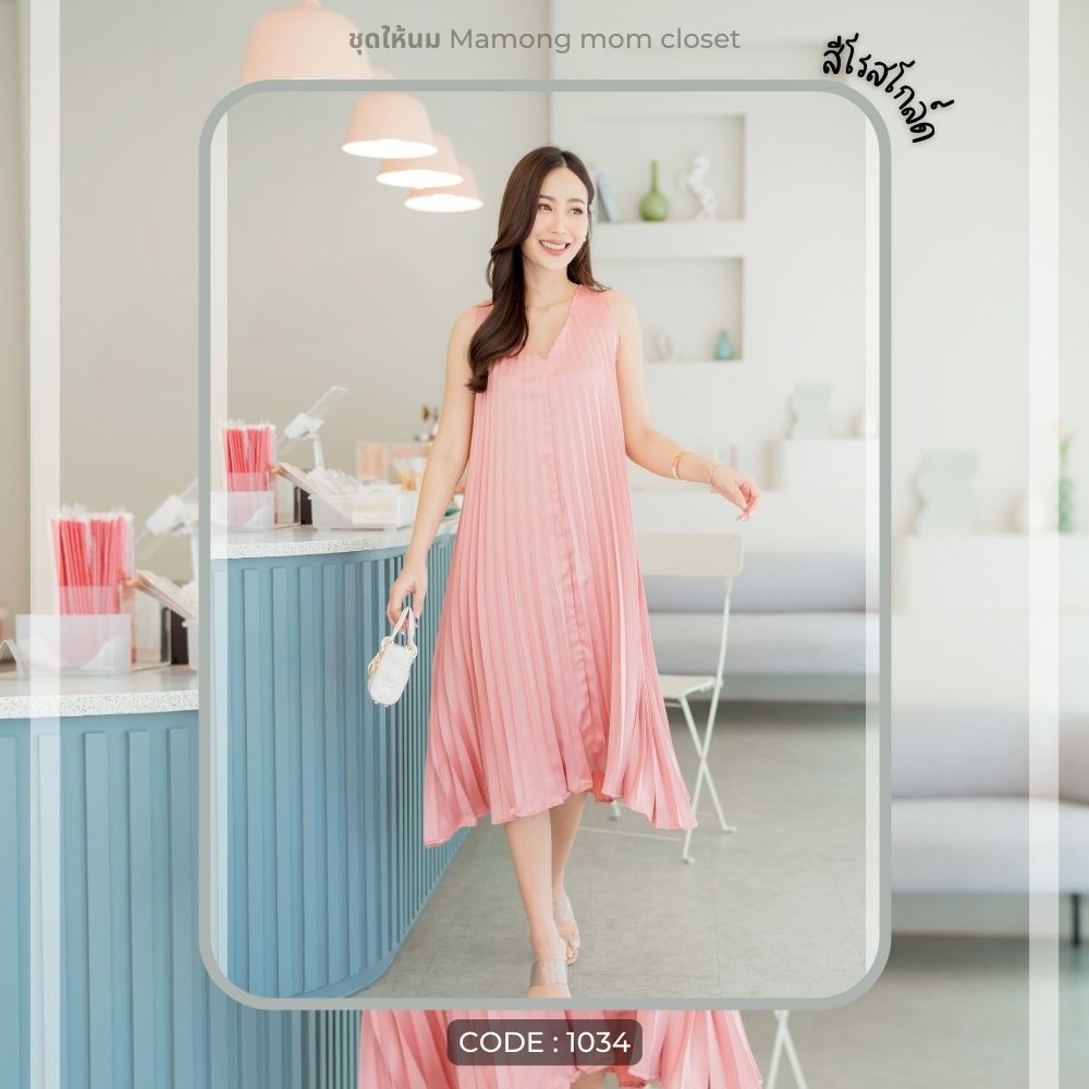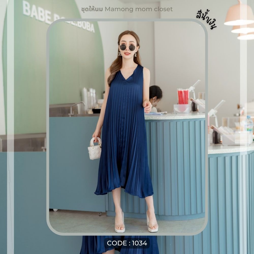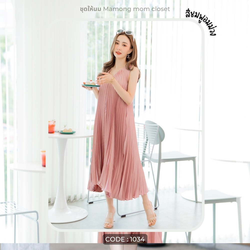 Mamong ชุดให้นม P1034 เดรสให้นมออกงานแขนกุดอัดพรีท คลุมท้องได้