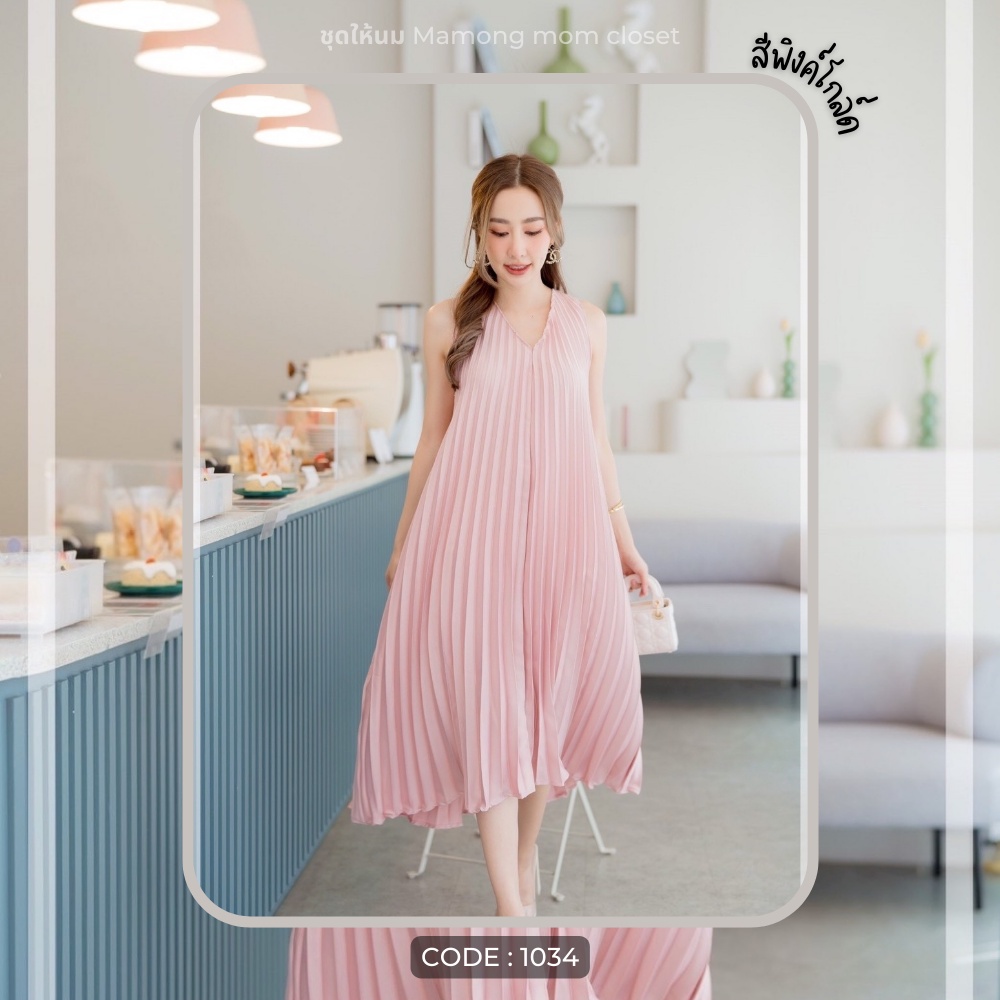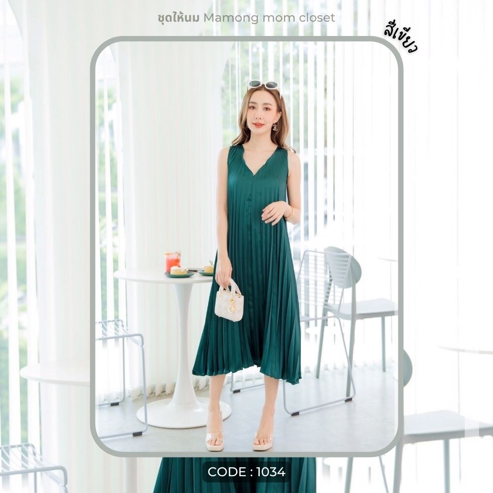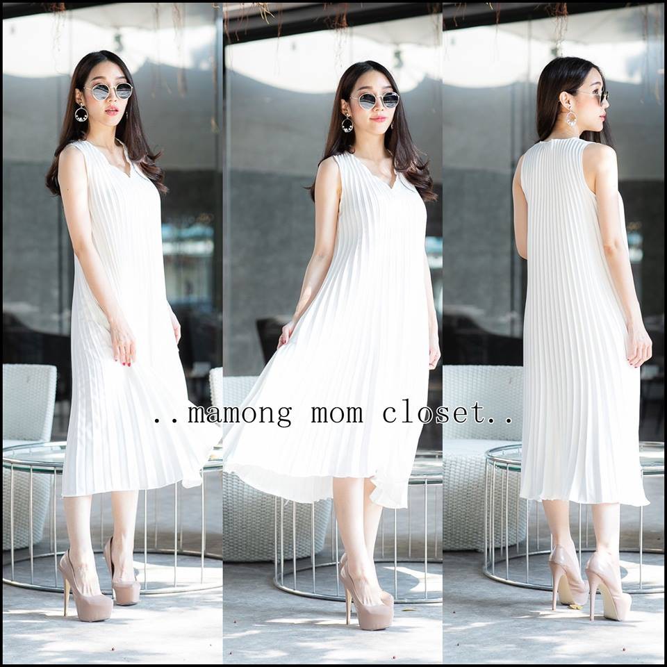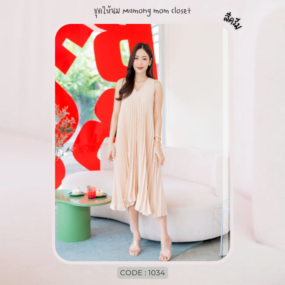 Mamong ชุดให้นม P1034 เดรสให้นมออกงานแขนกุดอัดพรีท คลุมท้องได้