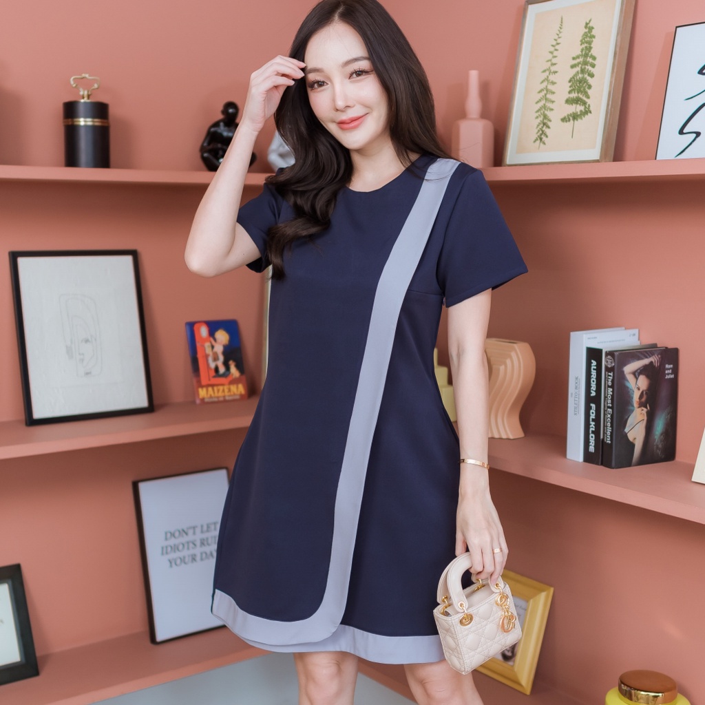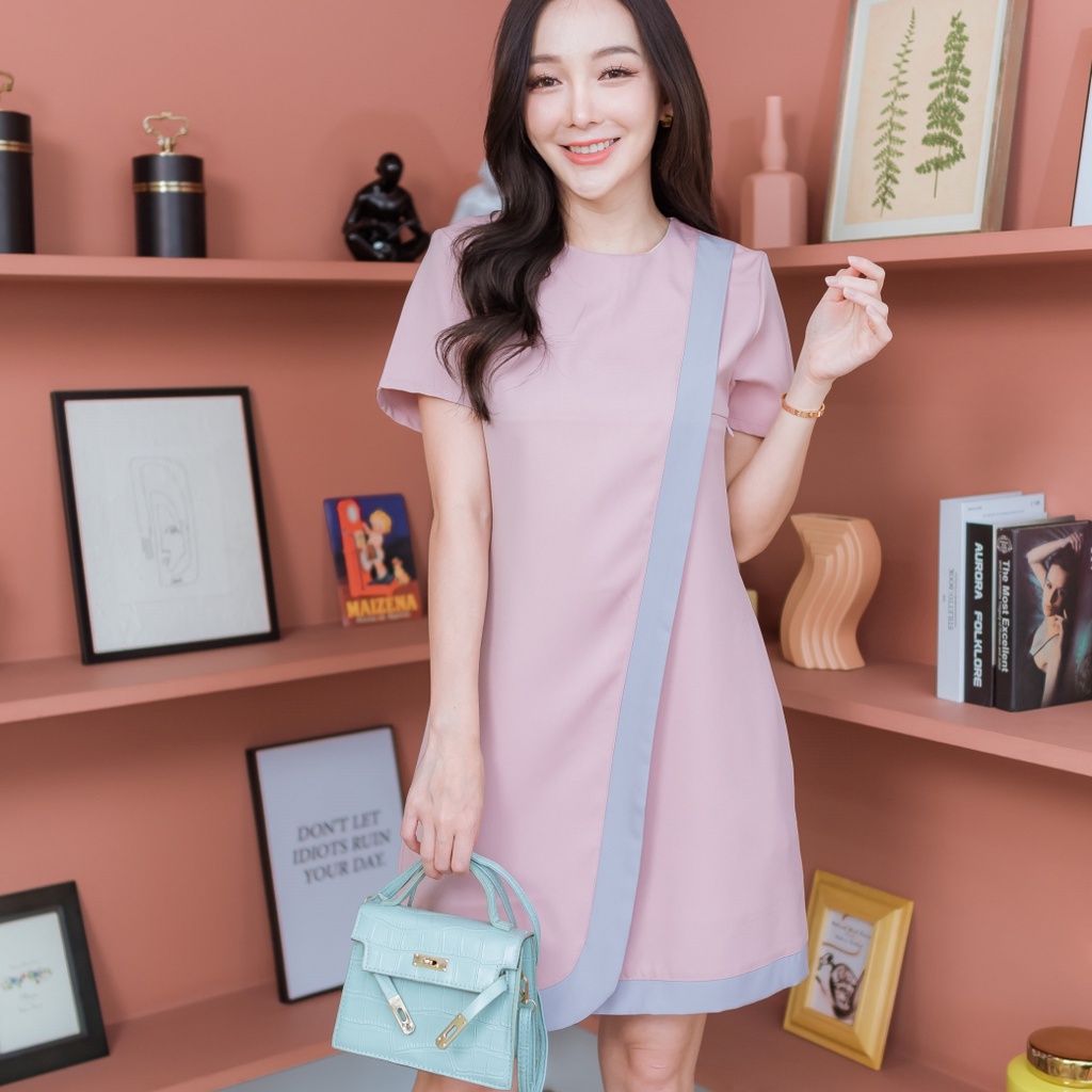 Mamong ชุดให้นม A249 เดรสให้นมสีพื้นเรียบแต่งแถบทูโทน