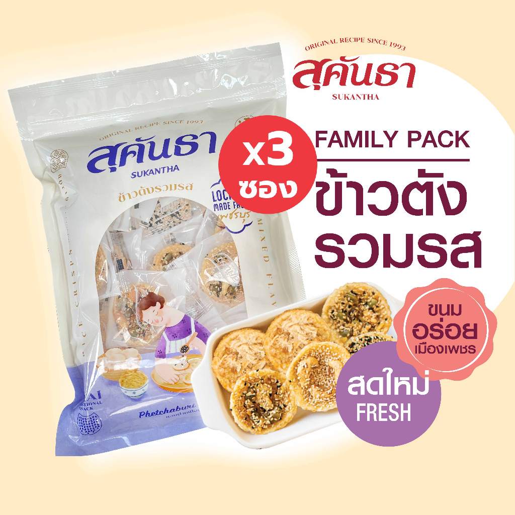 ขนมไทย สุคันธา ข้าวตังรวมรส 175 กรัม Set 3 ซอง ไซส์ Family pack ขนมอร่อยเพชรบุรี