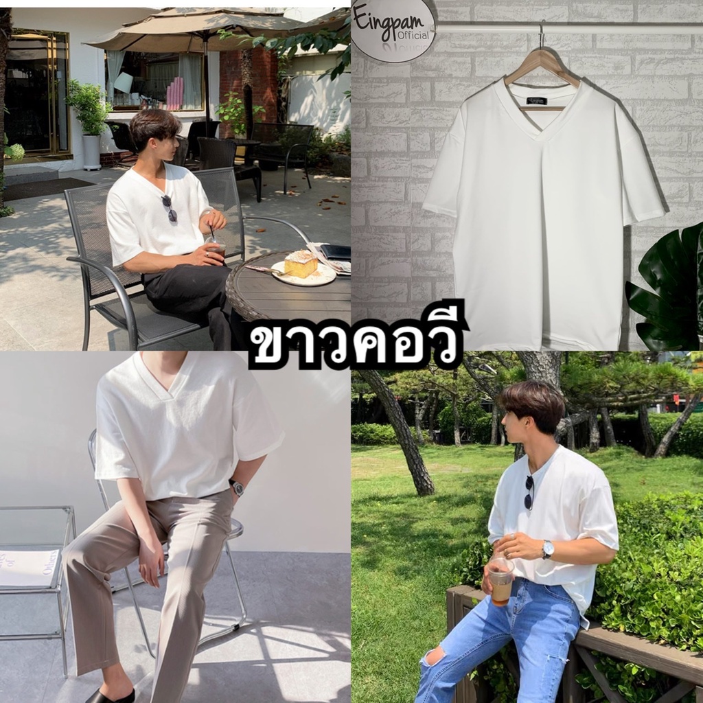 ซื้อผ่านวิดีโอลด30%💥ใช้ได้จริง! เสื้อยืดคอวี 🔥 เสื้อยืดผู้ชาย เสื้อโอเวอร์ไซส์คอวี สไตล์เกาหลีไหล่ตก