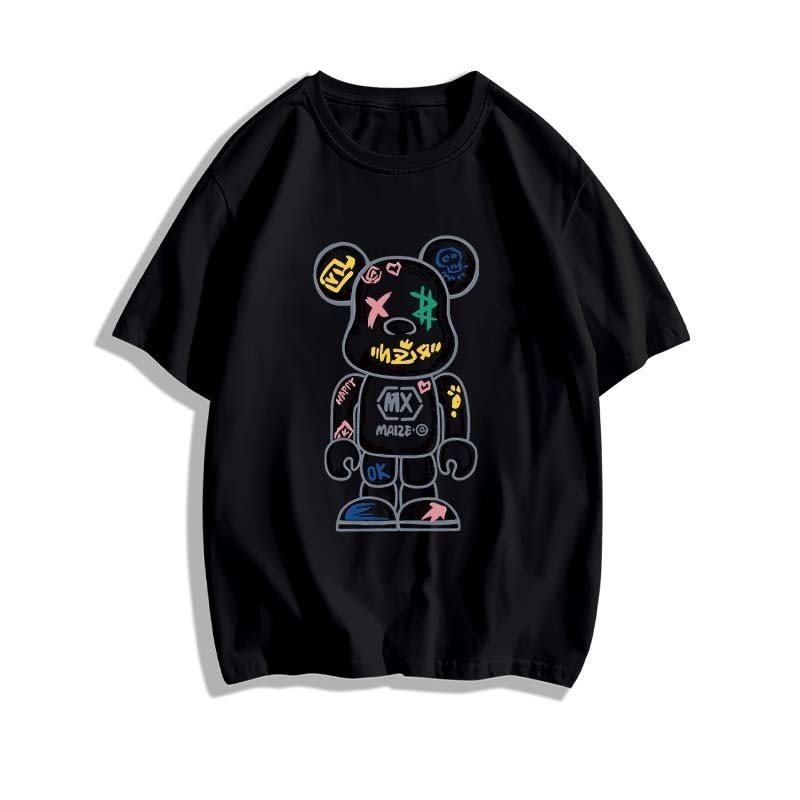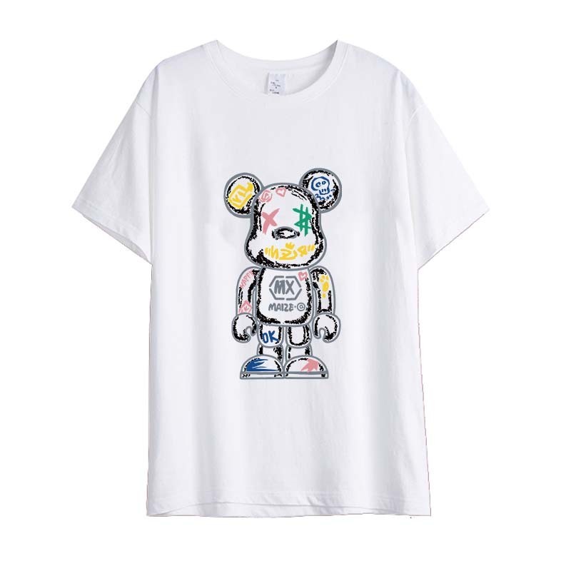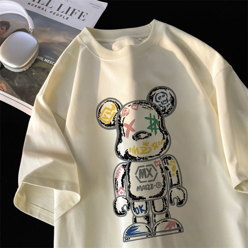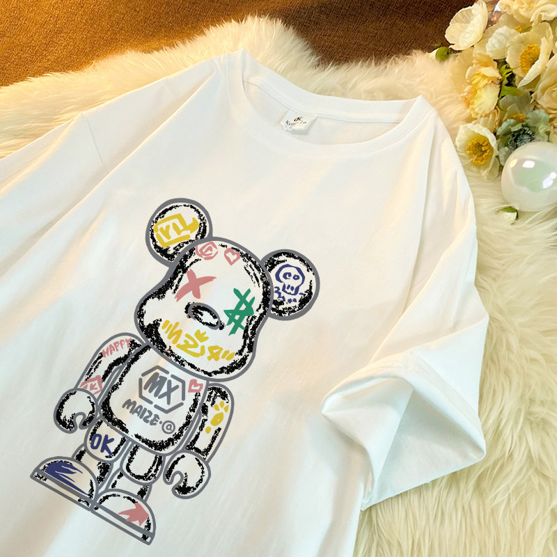 SELVZE(จัดส่งตลอด 24 ชั่วโมง) Printed T-shirt,หมีเรียบง่ายวินเทจพิมพ์หลวมพอดีแขนสั้นเสื้อยืด T1508