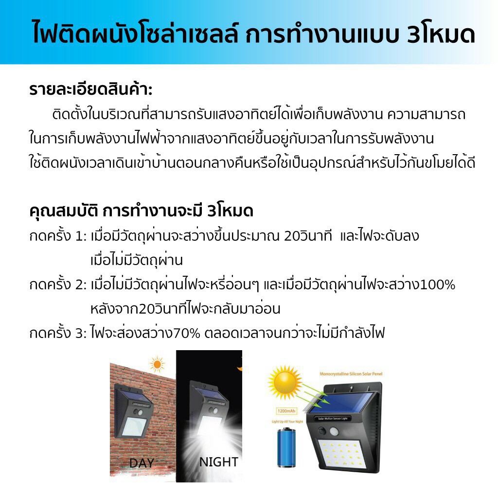 ไฟโซล่าเซลล์ ไฟติดผนัง โคมไฟโซลาร์เซลล์ หลอดไฟโซล่าเซลล์ solar cell solar light 30LED พลังงานแสงอาทิตย์