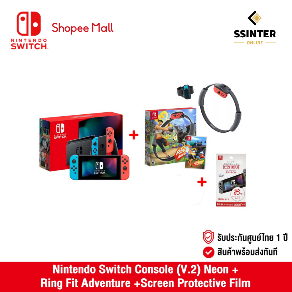 Nintendo Switch : Nintendo Switch Console (V.2) Neon + Ring Fit Adventure + Screen Protective Film (รับประกัน 1 ปี)