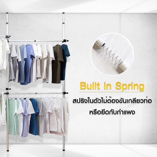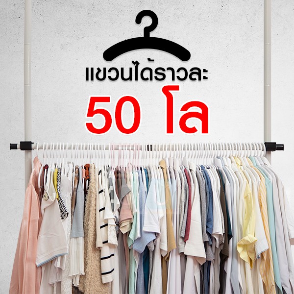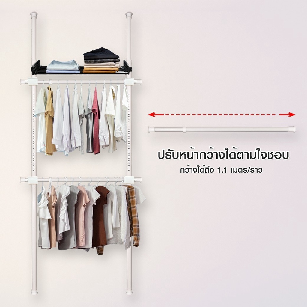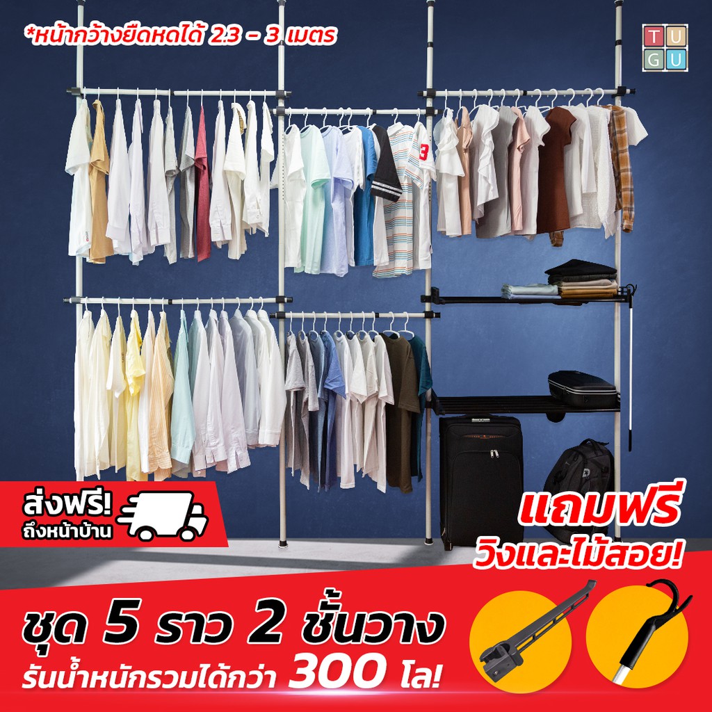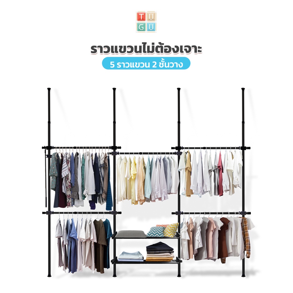 TUGU ราวแขวนไม่ต้องเจาะ 5 ราวแขวน 2 ชั้นวาง ราวแขวนไม่ต้องเจาะ แถมฟรีวิงแขวนและไม้สอย (R10)