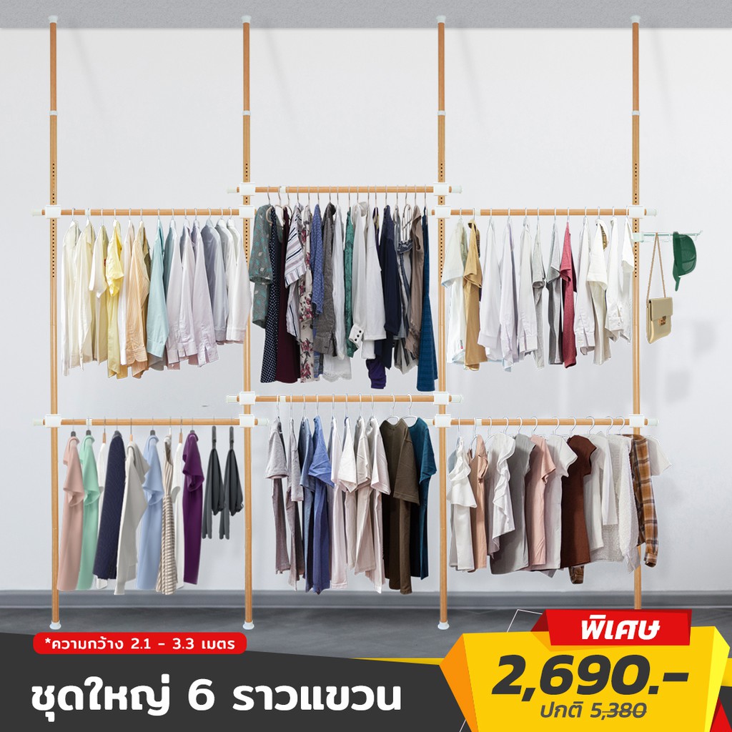 TUGU ราวแขวนเสื้อ ราวแขวนผ้า ราวแขวนไม่ต้องเจาะ ชุดใหญ่ 6 ราวแขวน ลายไม้ (R01M) แถมฟรี Wingแขวน ไม้สอยผ้า