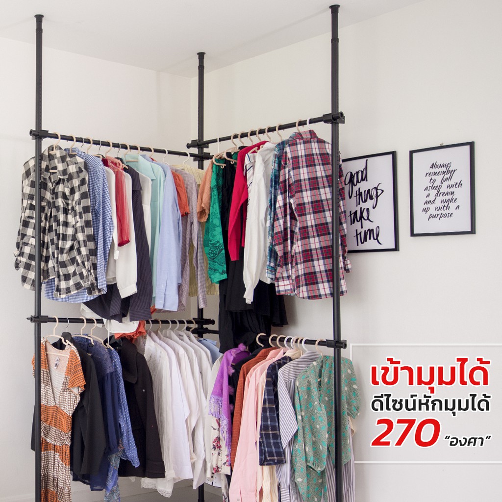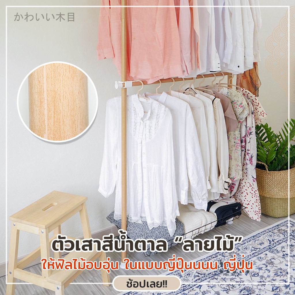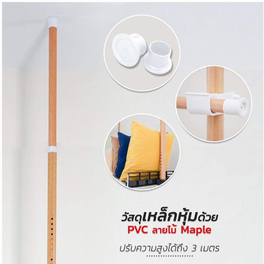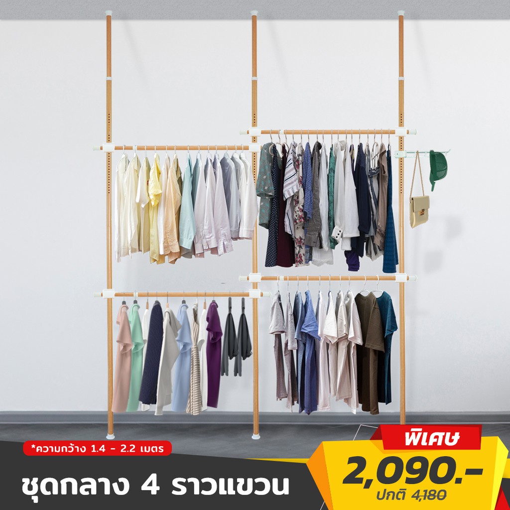 TUGU ราวแขวนเสื้อ ราวแขวนผ้า ราวแขวนไม่ต้องเจาะ ชุดกลาง 4 ราวแขวน ลายไม้ (R02M) แถมฟรี วิงแขวน ไม้สอยผ้า